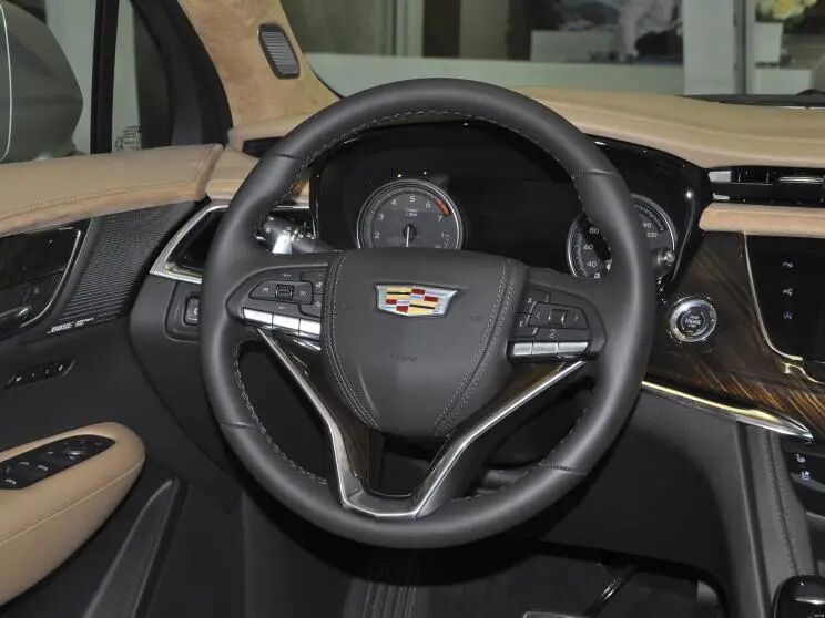 凯迪拉克XT6的方向盘,银色的镀铬饰条带来一定的豪华感,而两旁的多功能按键也很实用。
