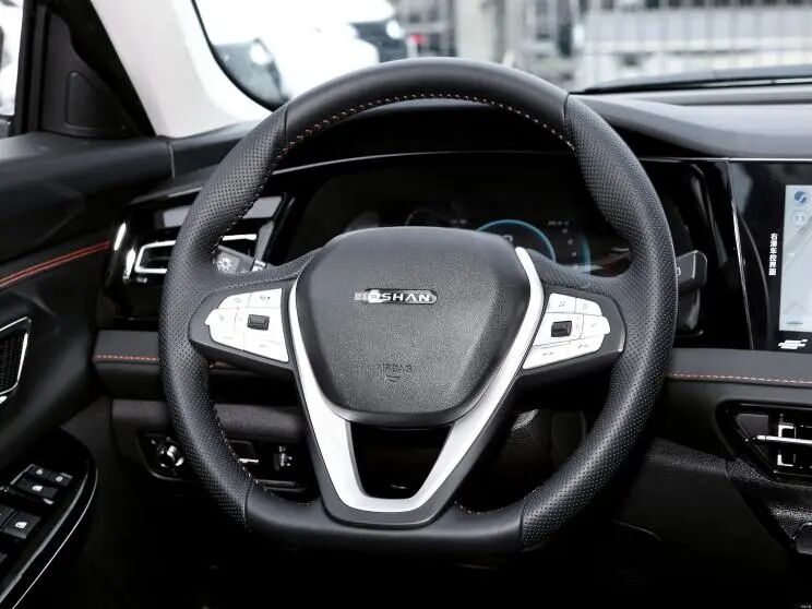 该车三辐式方向盘采用皮质材质,没有过多的装饰,造型比较传统。仪表运用全液晶的设计,看着有相当好的科技感。