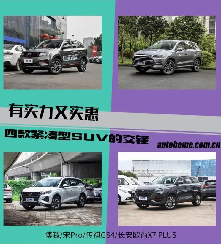 得益于中国汽车工业长久以来坚持的创新和发展,近些年来中国汽车品牌也拥有了一定的知名度,旗下车型也逐渐地赢得了国内消费者的认可,尤其体现在紧凑型SUV领域。今天我就为大家带来了吉利汽车-博越、比亚迪-宋Pro、广汽乘用车-传祺GS4、长安汽车-长安欧尚X7 PLUS四款优质紧凑型SUV,如果屏幕前的你对这几款车有兴趣的话,那就跟着我来一起看看吧!