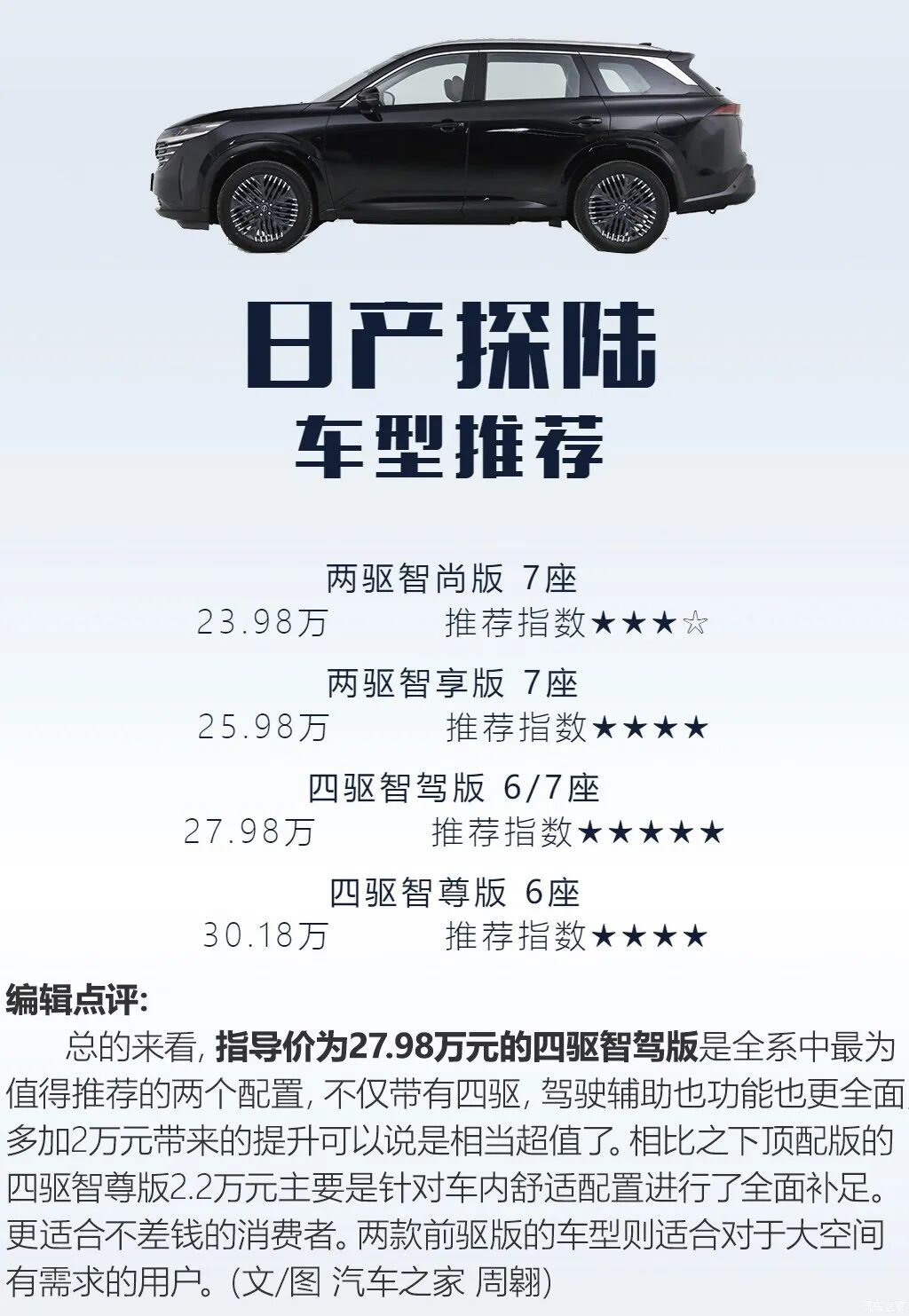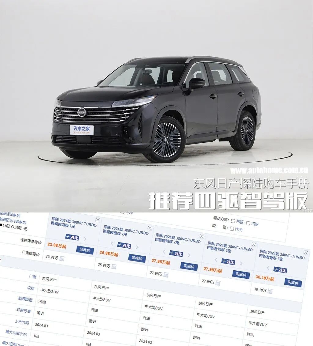 2024年3月6日,东风日产旗下全新SUV探陆正式上市,指导价格区间为23.98万-30.18万,共有五款车型。新车定位为中大型SUV,全系搭载2.0T发动机,搭配9挡手自一体变速箱,并提供六座、七座可选。话不多说,接下来让我们告诉你哪款车更值得买吧!
