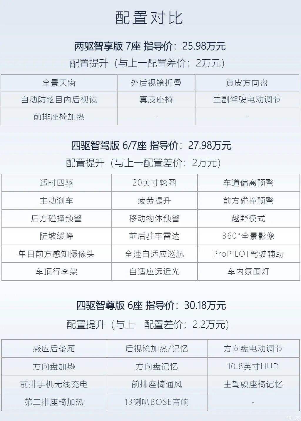 最后就是全系顶配的四驱智尊版,指导价来到了30.18万元,相比智驾版贵了2.2万,此次提升主要集中在车内舒适配置,比如座椅通风,第二排座椅加热,BOSE音响等,方向盘也换成了带加热记忆电动调节的版本,同时还有感应后备厢和前排手机无线充电,也是全系唯一带HUD抬头显示的版本,适合预算最为充足的用户购买。