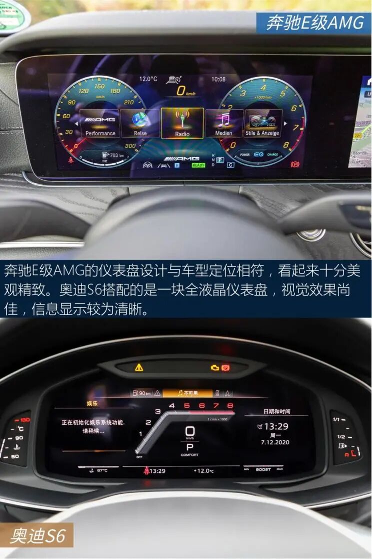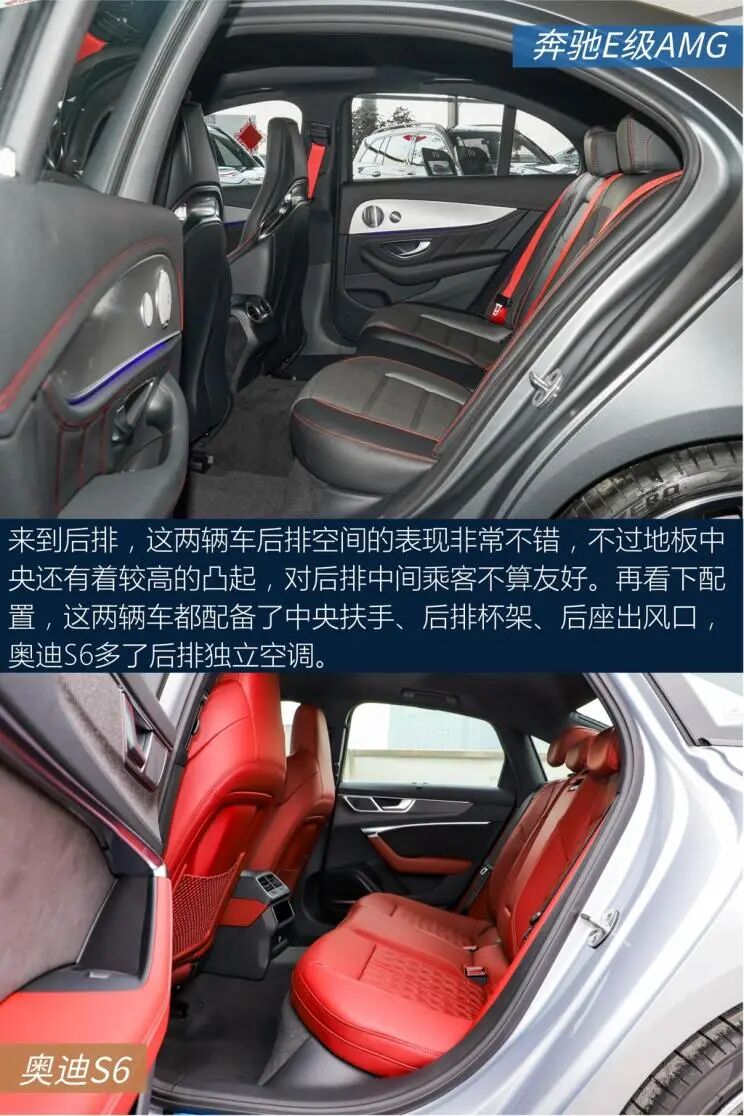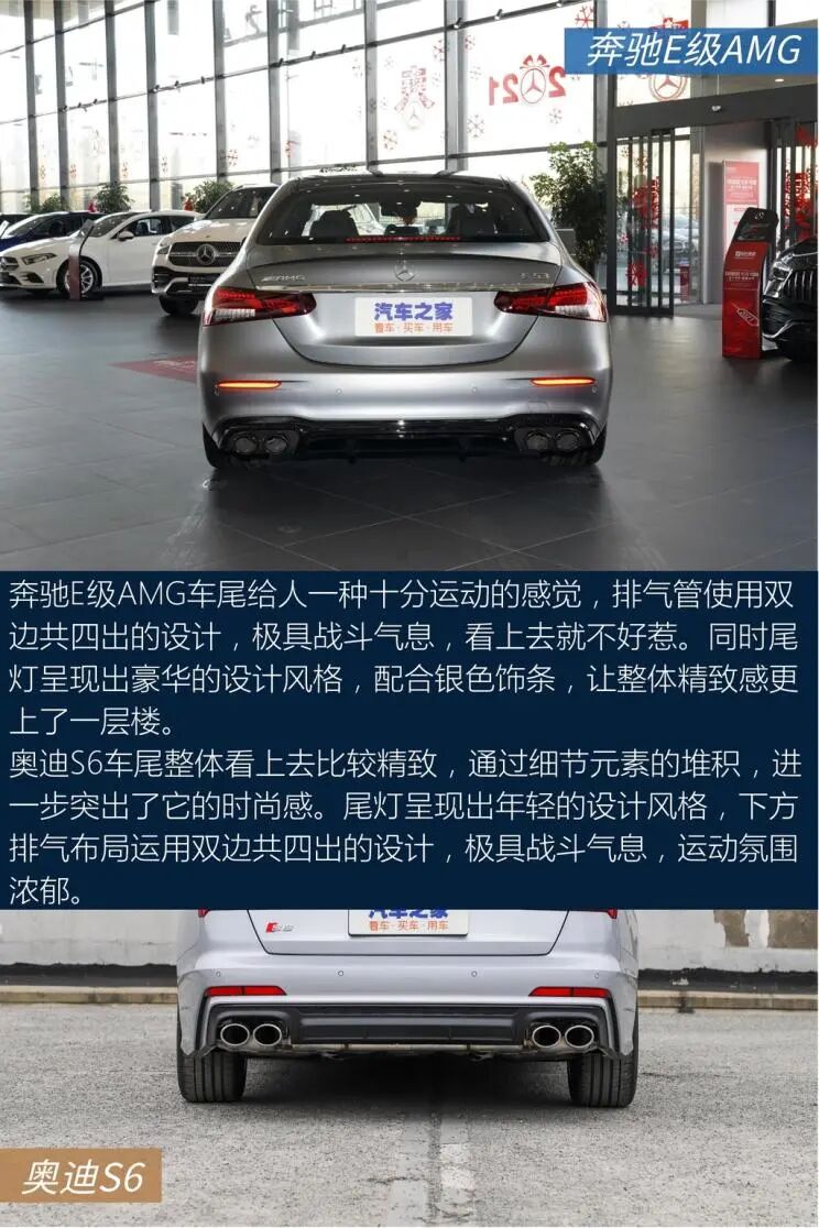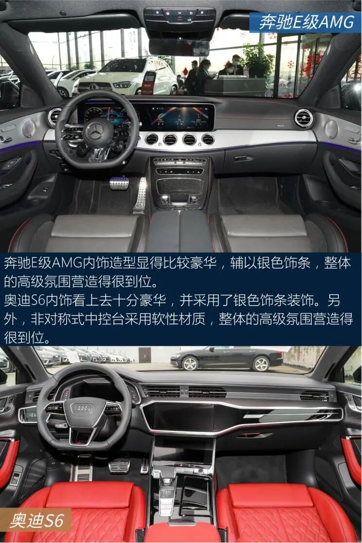 以上就是关于两车的全部内容了,不知道会不会对大家选车有帮助。梅赛德斯-AMG-奔驰E级AMG中控屏尺寸是12.3英寸,双联屏的设计视觉上看着富有时尚气息。中网采用直瀑式的设计,加上线条大气的车头,给人一种非常运动的感觉,提升了整车的档次。奥迪(进口)-奥迪S6官方0-100km/h加速为4.5s,动力随叫随到,输出相当迅猛。这款车配备可开启全景天窗,能进一步提高采光率,让车内空间变得更明亮。那么如果这两款车让你选的话,你会选择哪一款呢?