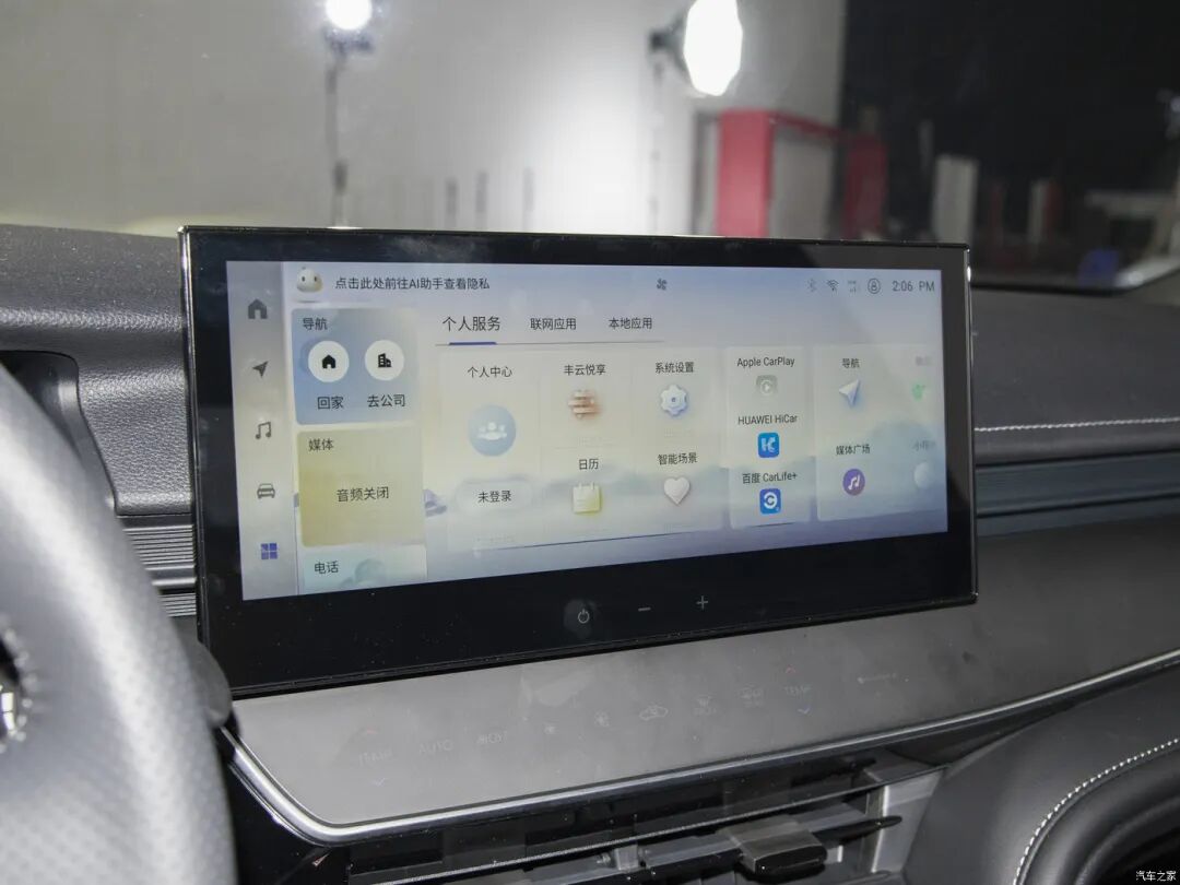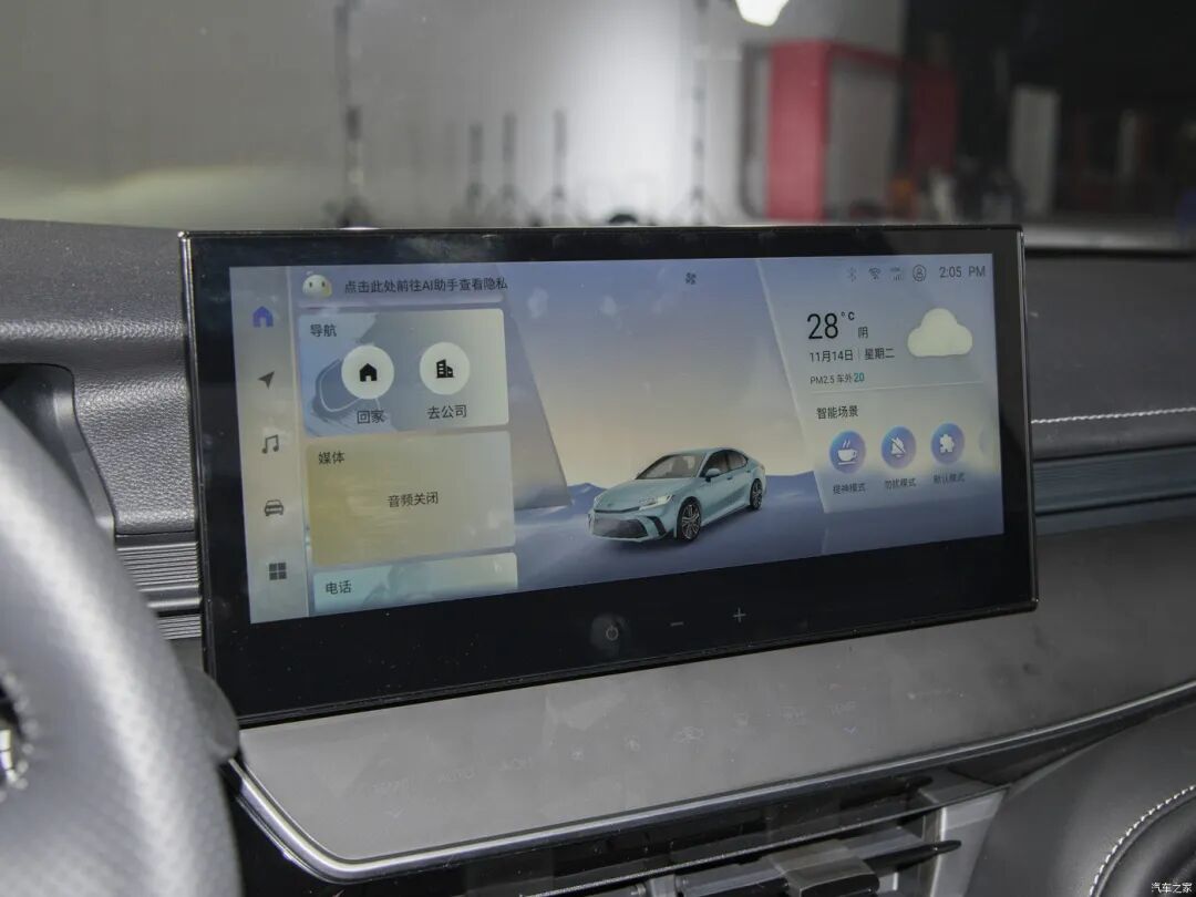 高配车型采用12.3英寸中控屏,采用高通骁龙8155车机芯片,提供12+128GB内存。拥有智能场景、导航、在线影音娱乐、语音助手、苹果CarPlay、华为HiCar、百度CarLife、智能家居、微信、小程序、倒车影像等功能。此外,大屏下方设置有光感触控快捷按键。