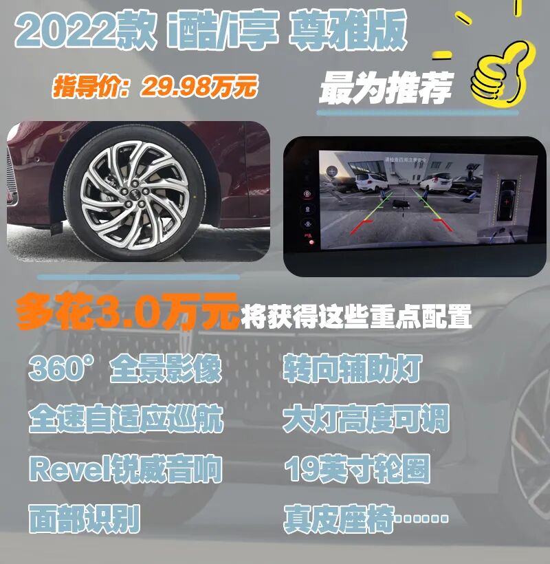 在上一配置车型的基础上再多花3万元,可以买到i酷/i享 尊雅版,为全系次顶配车型。3万元的确不是一笔小数,但可为用户带来更高维度的用车体验。由于增加的配置类别较为全面,索性就用车内外来做区分,也有助于各位理解。外部配置方面,轮圈升级至19英寸,并增加转向辅助灯、大灯高度可调、外后视镜记忆/倒车自动下翻/自动防眩目功能,颜值、功能两手抓。