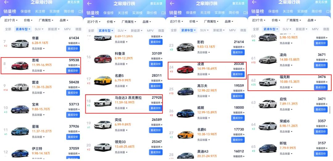无需回顾太远,仅看近三个月的销量数据,福克斯就被对手虐得体无完肤。轩逸、卡罗拉这类家用紧凑型车姑且不谈,偏冷门的昂克赛拉和凌渡的销量都呈领先之势,至于“神车”思域就更不必多说了。