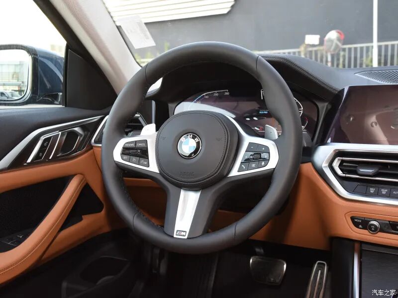 4系的内饰布局和3系大同小异,配色上入门版车型采用黑色/干邑色设计,视觉感受更具品质感。在配置层面,方向盘换挡拨片、12.3英寸液晶仪表、10.25英寸中控屏幕、分区自动空调为全系标配,此外中控屏幕支持车联网、手机互联、倒车影像功能。