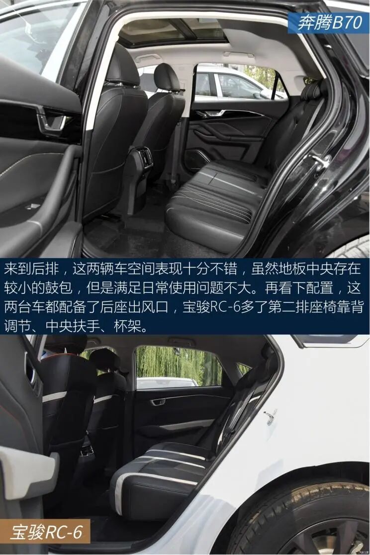 那么关于两车的具体介绍就到这里,最后我们再做一个小小的总结。一汽奔腾-奔腾B70中网使用点阵式的设计,配合线条精致的车头,看上去十分精巧,整体略显高级,很有层次感。该车配备可开启全景天窗,能进一步提高采光率,让车内空间变得更明亮。上汽通用五菱-宝骏RC-6后排空间表现不错,较大的乘坐空间能带来更好的乘坐体验。中控屏尺寸为10.25英寸,中控屏采用悬浮式的设计,屏幕尺寸较大,科技感非常强烈。那么如果这两款车让你选的话,你会选择哪一款呢?