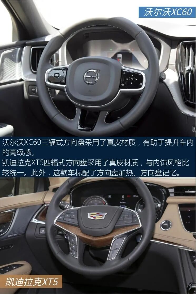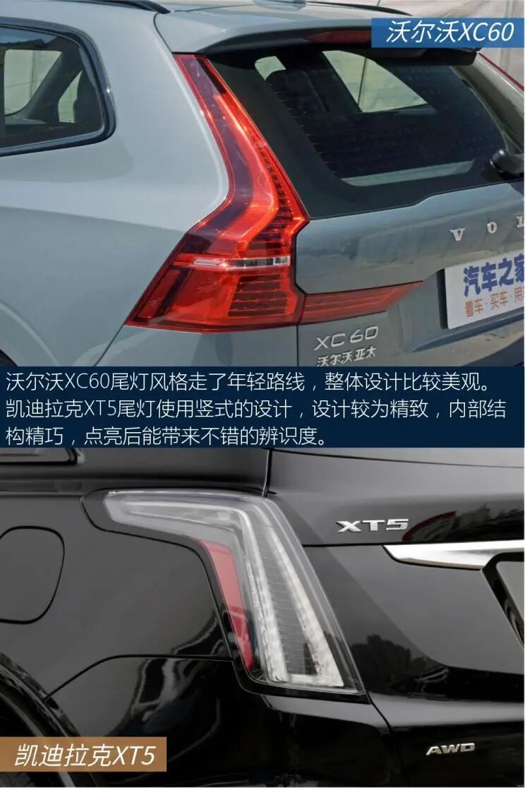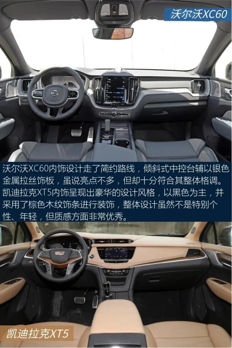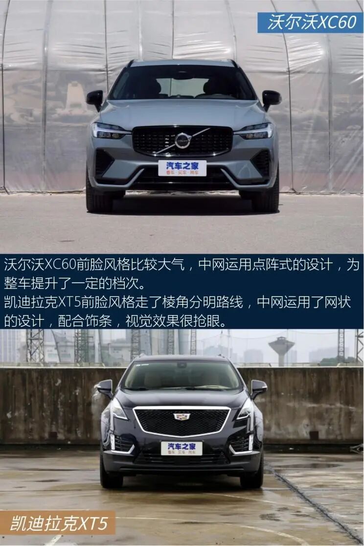 以上就是关于两车的全部内容了,不知道会不会对大家选车有帮助。沃尔沃亚太-沃尔沃XC60中控屏尺寸为9英寸,中控屏采用嵌入式的设计,造型简洁明了,实用性不错。中网运用点阵式的设计,配合线条大气的车头,风格比较端庄,稳重中透着大方。上汽通用凯迪拉克-凯迪拉克XT5车侧呈现出精致的设计风格,细节处理相当到位,令人满意。对称式中控台视觉效果很工整。这两款车的实力都很强,具体怎么选还得看个人的用车需求。