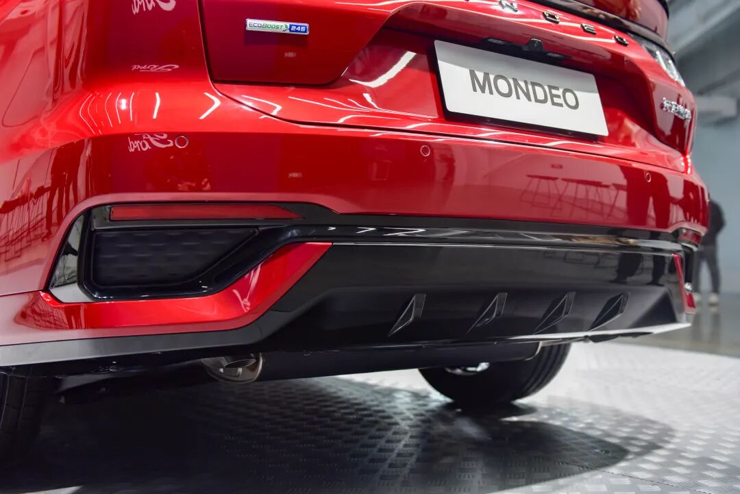 车尾造型层次分明,不乏高级感。ST-Line车型在原有的小鸭尾设计上增加了亮黑色扰流板。贯穿式尾灯组同样不乏细节,除渐变灯带外,还提供有“三道杠”式灯腔结构。中置的“MONDEO”字母与排气装饰均进行了黑化处理,搭配下方黑色扩散器,运动氛围再次放大。