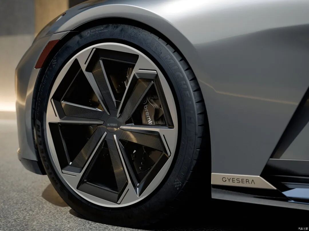 来看新车,Karma Gyesera其实可以看作是针对GS-6的一次产品升级,该车外观依旧保留着一些家族式设计元素。前脸采用不规则造型的大灯,并换装了封闭式格栅设计,下包围通风口可以帮助散热并提升空气动力学效果。