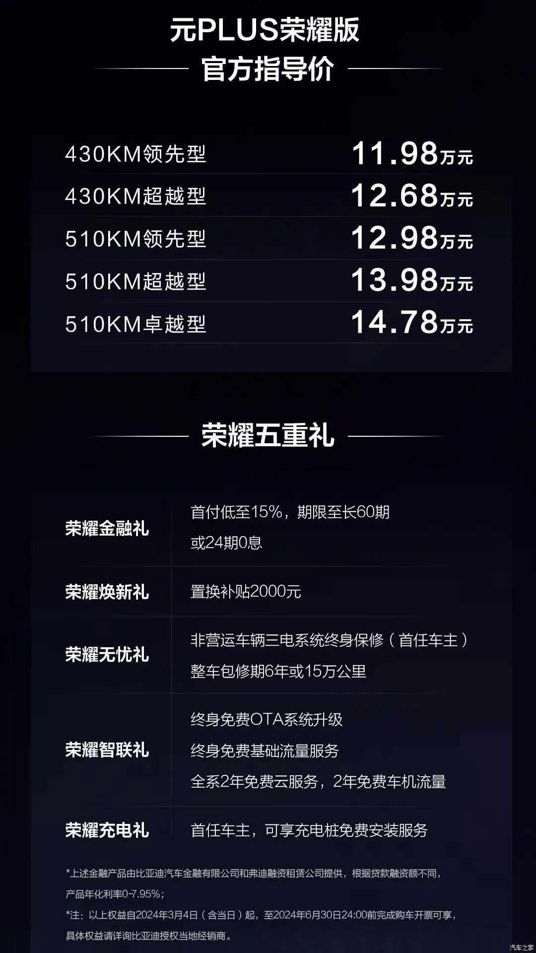 3月4日,我们从比亚迪官方了解到,旗下紧凑型SUV——元PLUS荣耀版正式上市,新车共推出5款配置,售价区间为11.98-14.78万元。同时,新车还带来了黑骑士款外观/内饰,同时升级智能语音连续通话以及全系标配宽温域高效热泵系统等。关于新车详细售价,见下表: