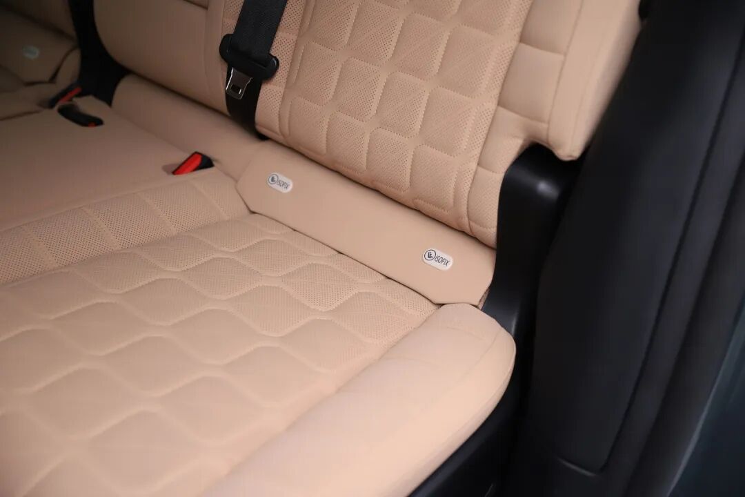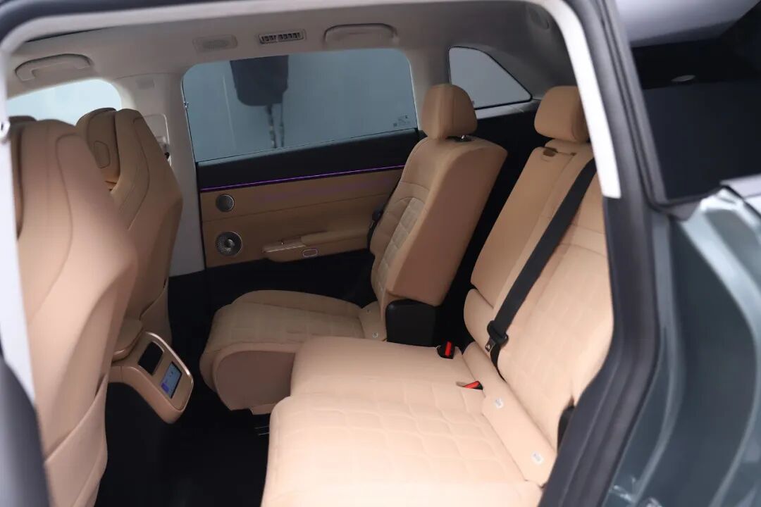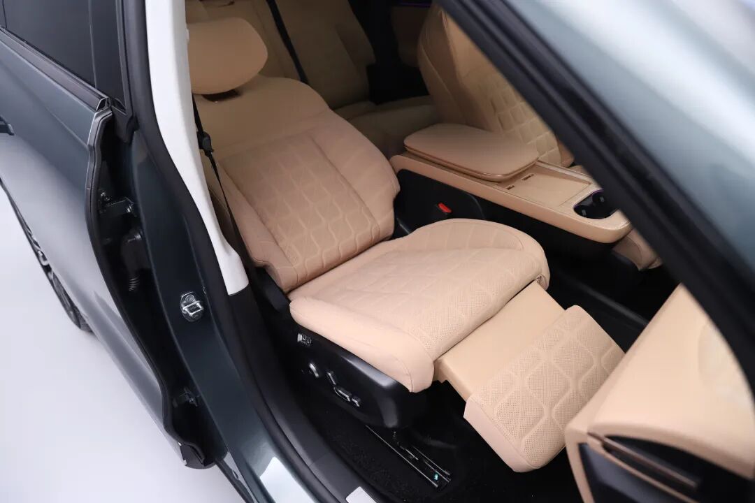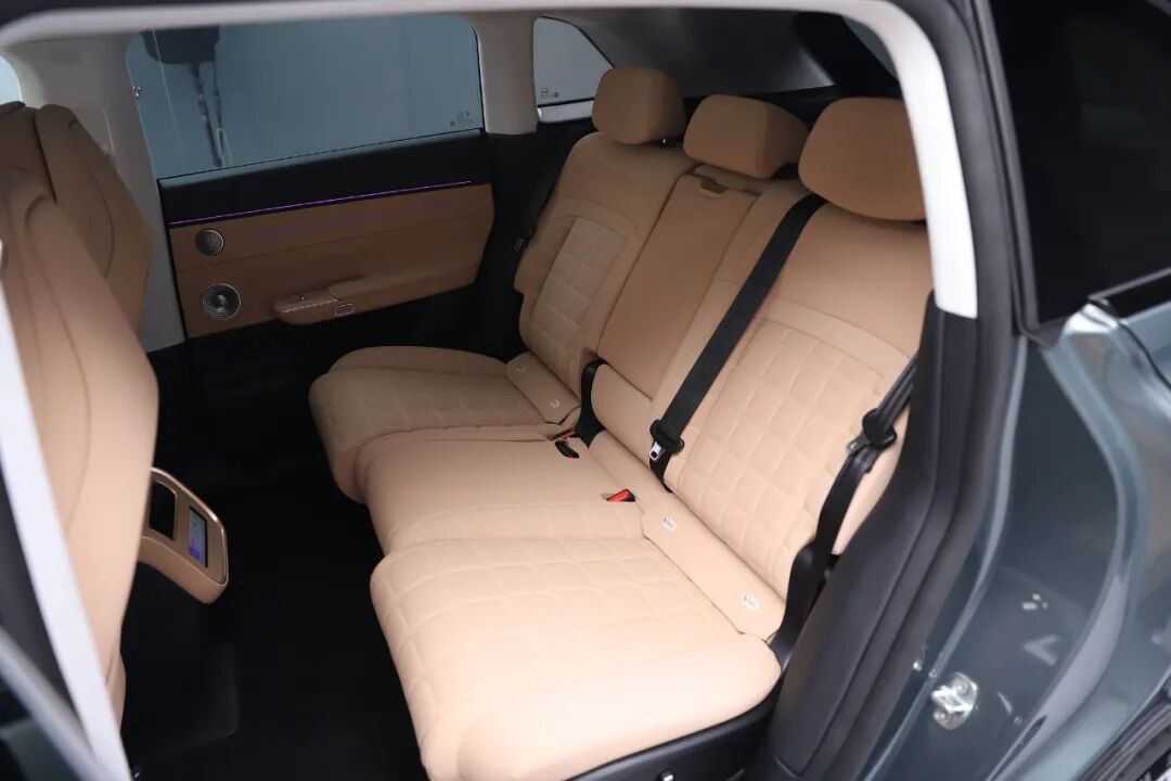后排座椅支持四向电动调节,靠背角度可在115-129度之间调节,并且座椅填充舒适度和座垫长度也无需担心。儿童安全座椅接口被一块“盖板”遮挡,掀开之后就会露出接口,这样设置要比藏在缝隙中更方便操作。此外,后排也设置有窄条形屏幕可对空调、座椅、多媒体等进行调整。