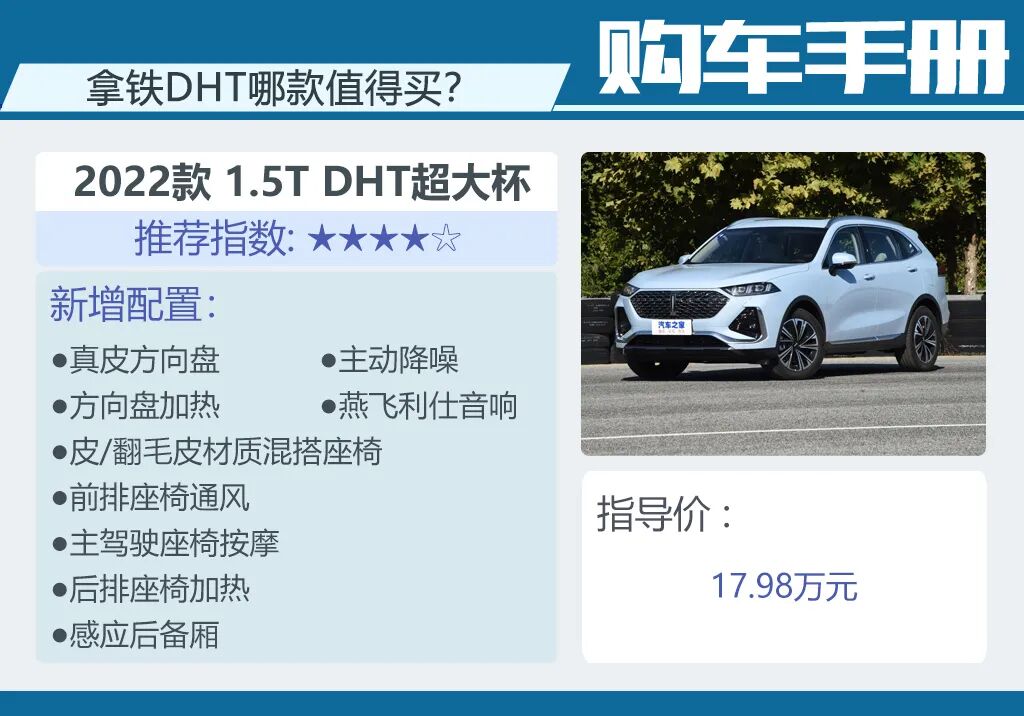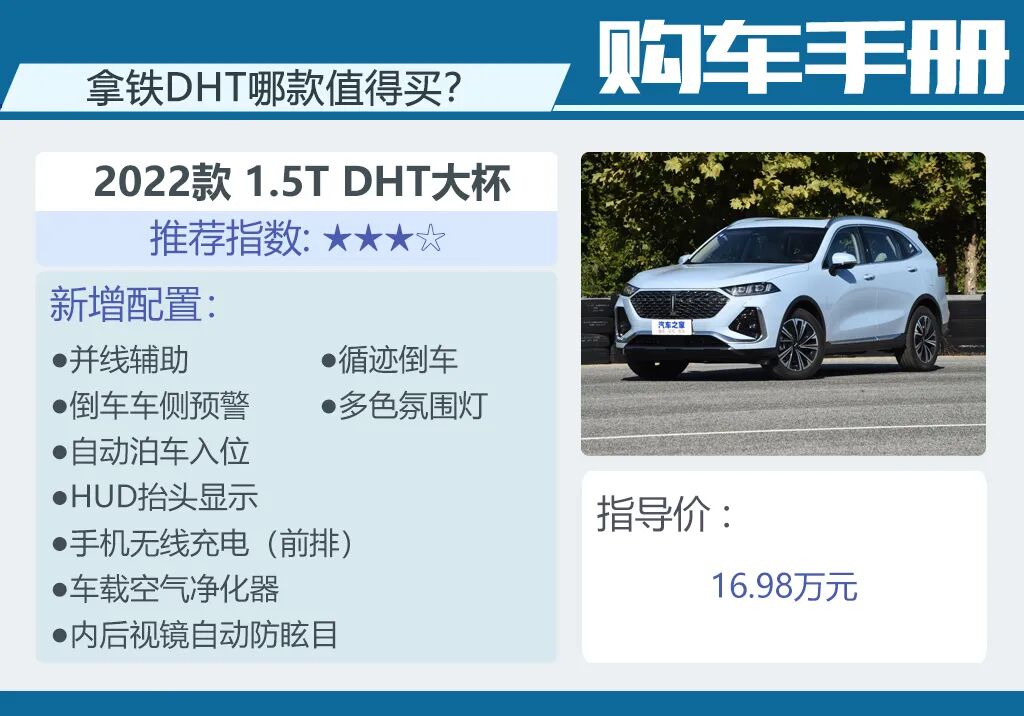 2022款 1.5T DHT大杯在入门车型上的基础上,增加了并线辅助、倒车车侧预警、自动泊车入位、HUD抬头显示、手机无线充电(前排)、多色氛围灯、内后视镜自动防眩目、车载空气净化器、循迹倒车等多项配置。总体来说,这些配置的实用性并不差,但更像是“锦上添花”,并非不可或缺,相比之下,我认为入门车型更具有性价比。