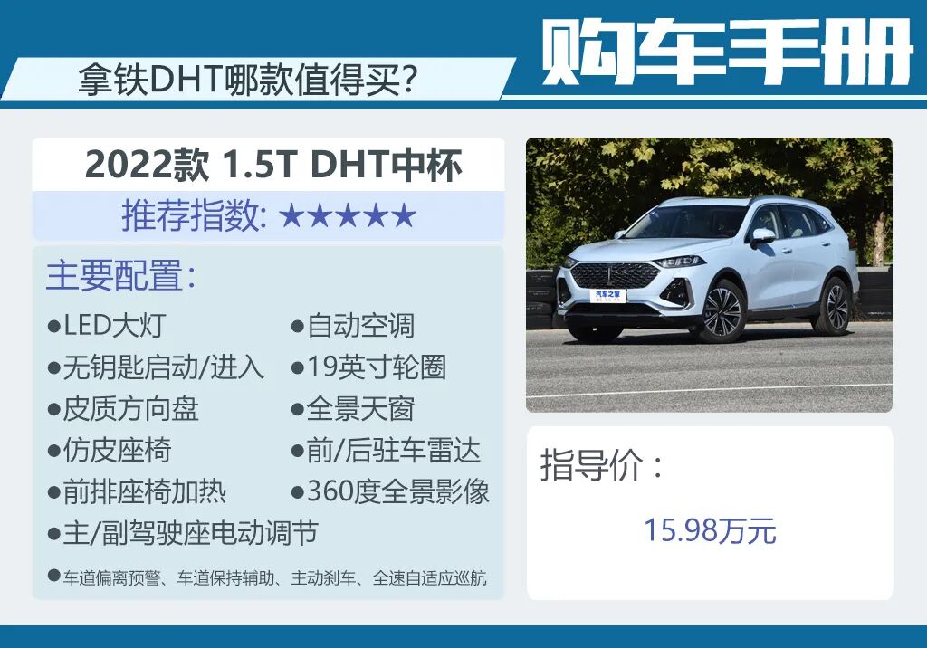 2022款 1.5T DHT中杯作为入门车型,配备了LED大灯、19英寸轮圈、无钥匙启动/进入、皮质方向盘、仿皮座椅、主/副驾驶座电动调节、前排座椅加热、自动空调、全景天窗、前/后驻车雷达、360度全景影像、车道偏离预警、车道保持辅助、主动刹车、全速自适应巡航等多项配置,整体配置表现足够丰富,值得推荐购买。