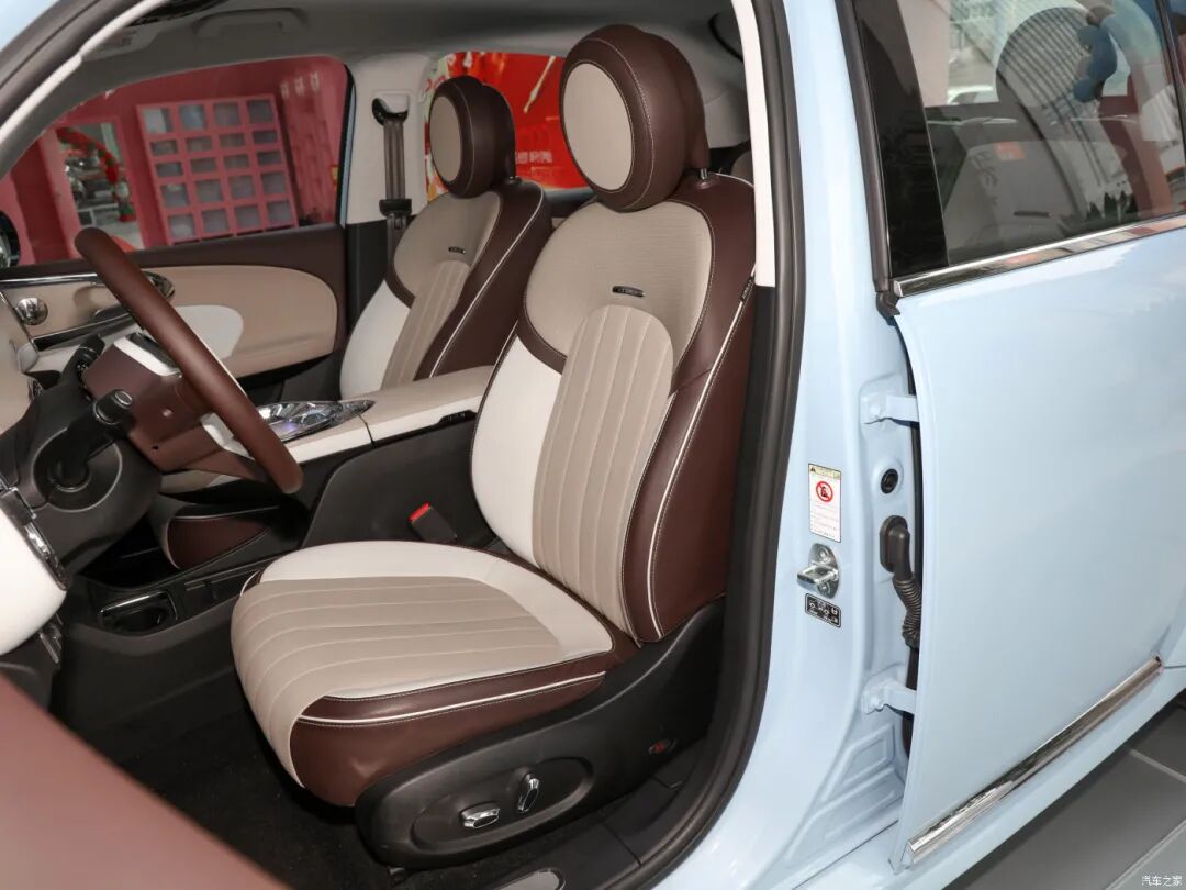 内饰方面,新车将科技氛围和复古风格很好的融合在了一起,相当精致。仪表盘和中控台延续了连屏设计,搭配圆边矩形的空调出风口,看起来很萌。复古风格的方向盘是亮点之一,双拼的配色高级氛围浓郁,真皮材质细腻,握感饱满。