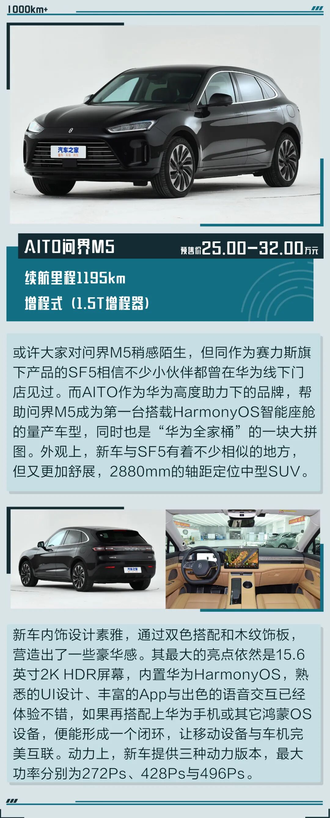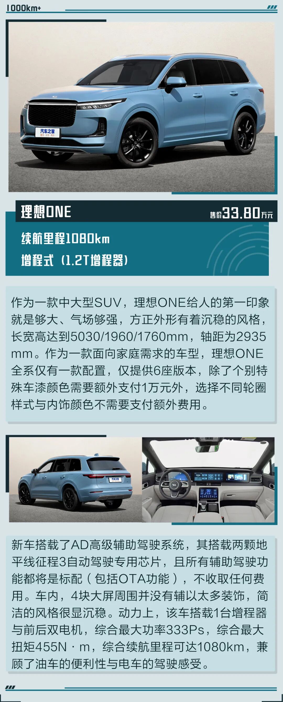 今天为各位介绍的五款车型,涵盖了纯电动、插电式混动与增程式。对于电动车而言,综合续航1000km似乎完全满足大部分用车场景,即使面临“续航打折”,又或是长距离跨城市出行,在充电桩布局已相对完善的今天,700km以上的实测续航,基本可以告别“续航焦虑”了。