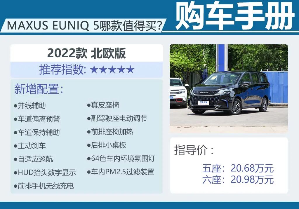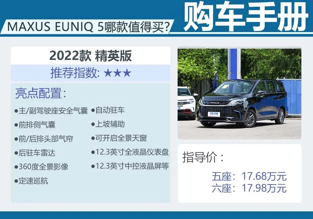 MPV已经是很多家庭购车时的首选,上汽大通MAXUS EUNIQ 5(以下简称EUNIQ 5)就是紧凑型MPV中一款强有力的产品。2022款车型于2021年10月正式上市,售价区间为17.68-20.98万元,新车提供五座和六座两种座椅布局选择。