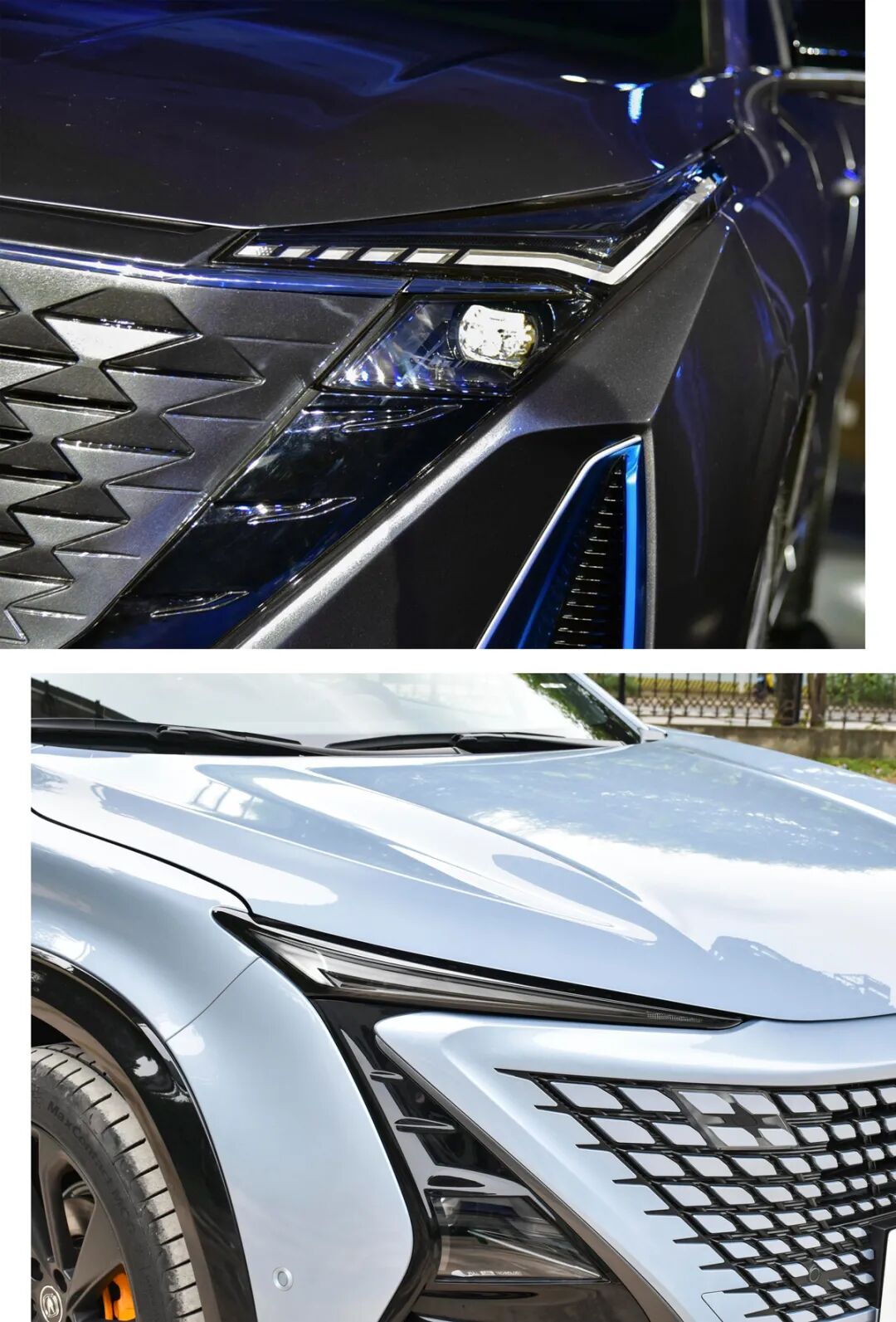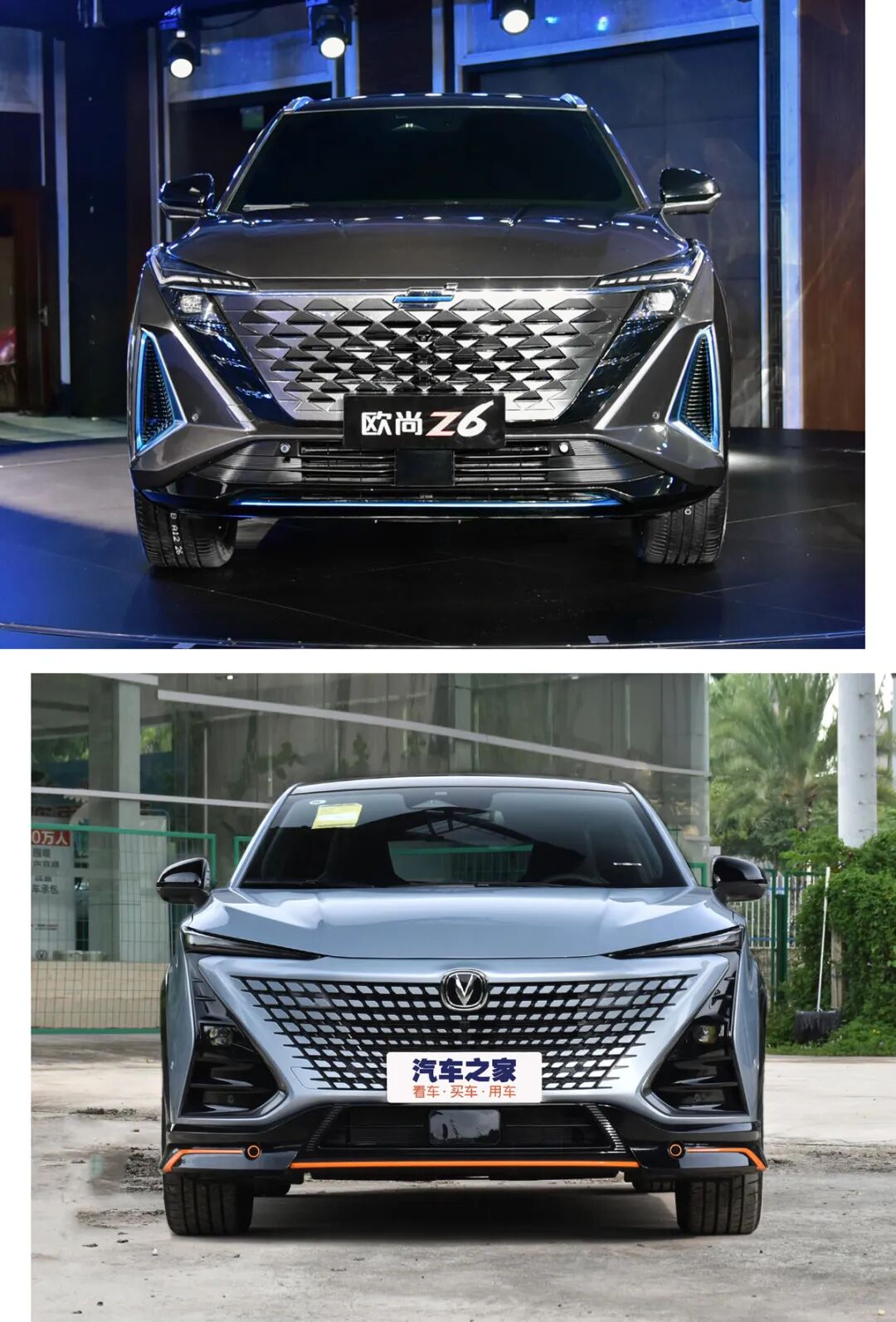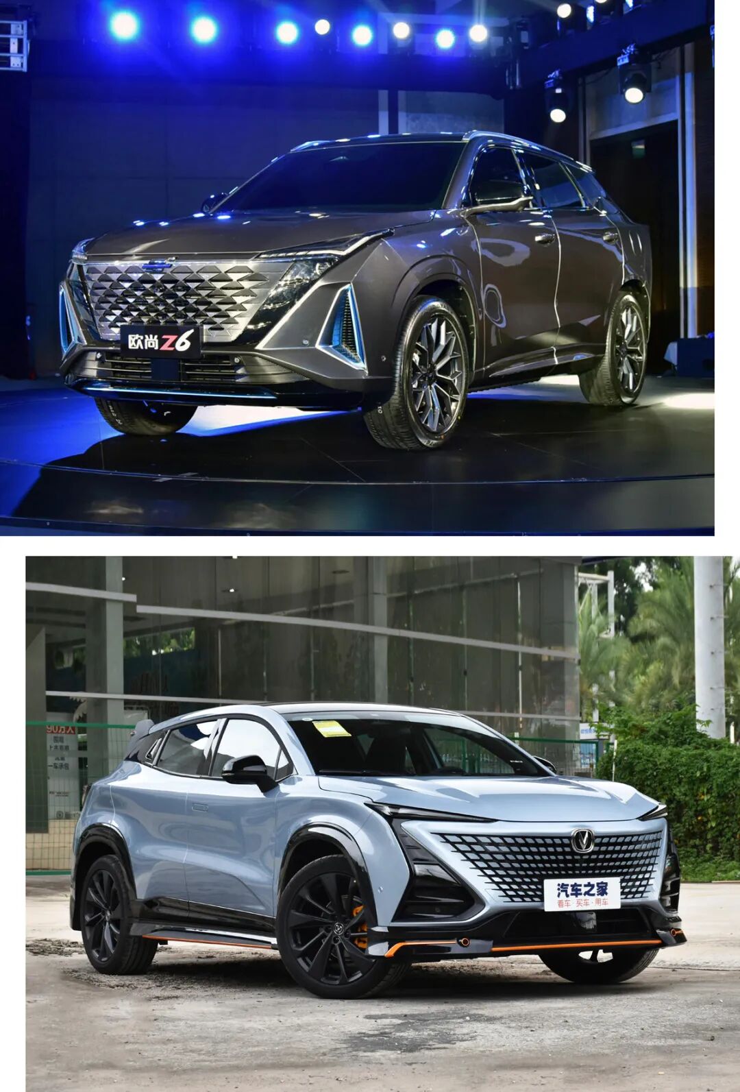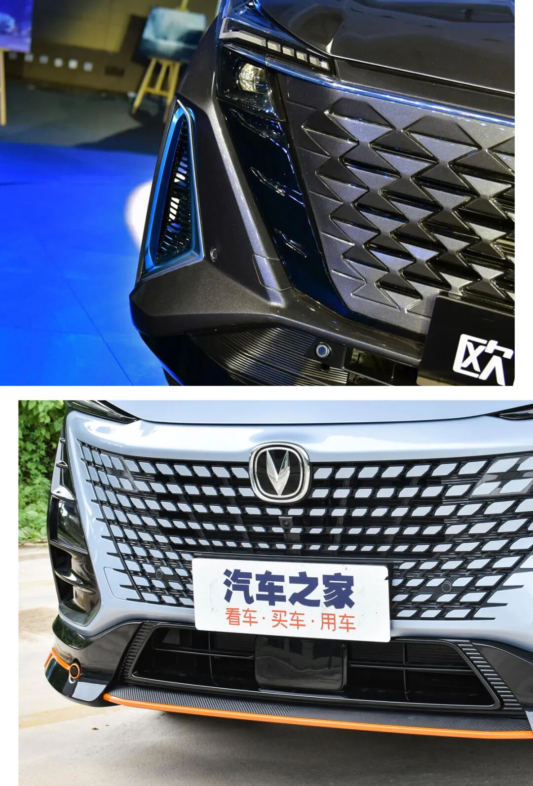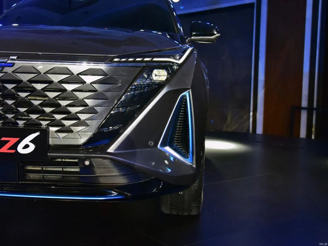 两台车都在前包围加入了撞色饰条,UNI-T仅是为了配色新颖,而欧尚Z6则是通过蓝色点缀来区分燃油版与PHEV版车型,另外其两侧格栅真的采用了镂空设计。