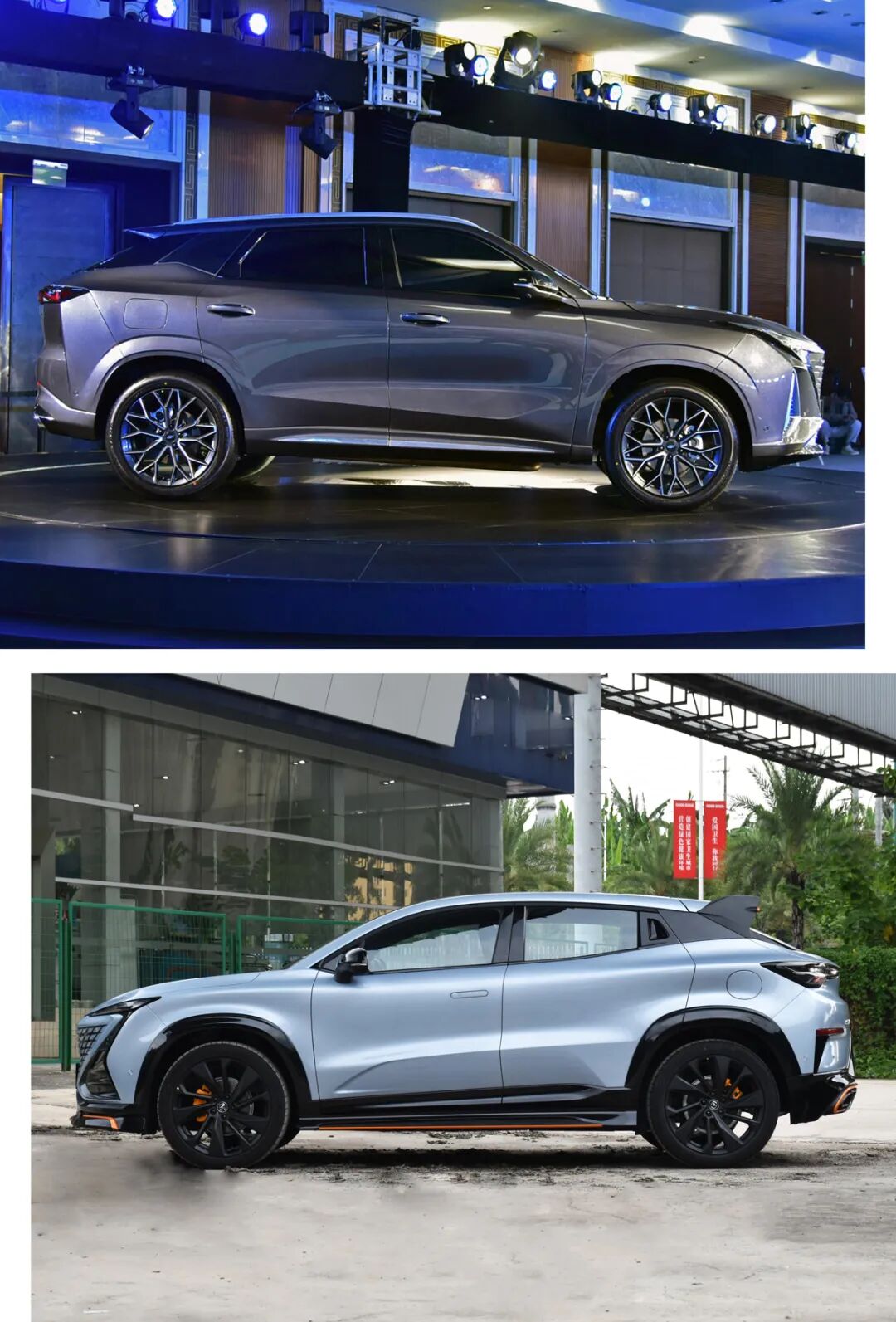 两款车均采用溜背式造型,并且都有着高挑的腰线与悬浮式车顶设计。
