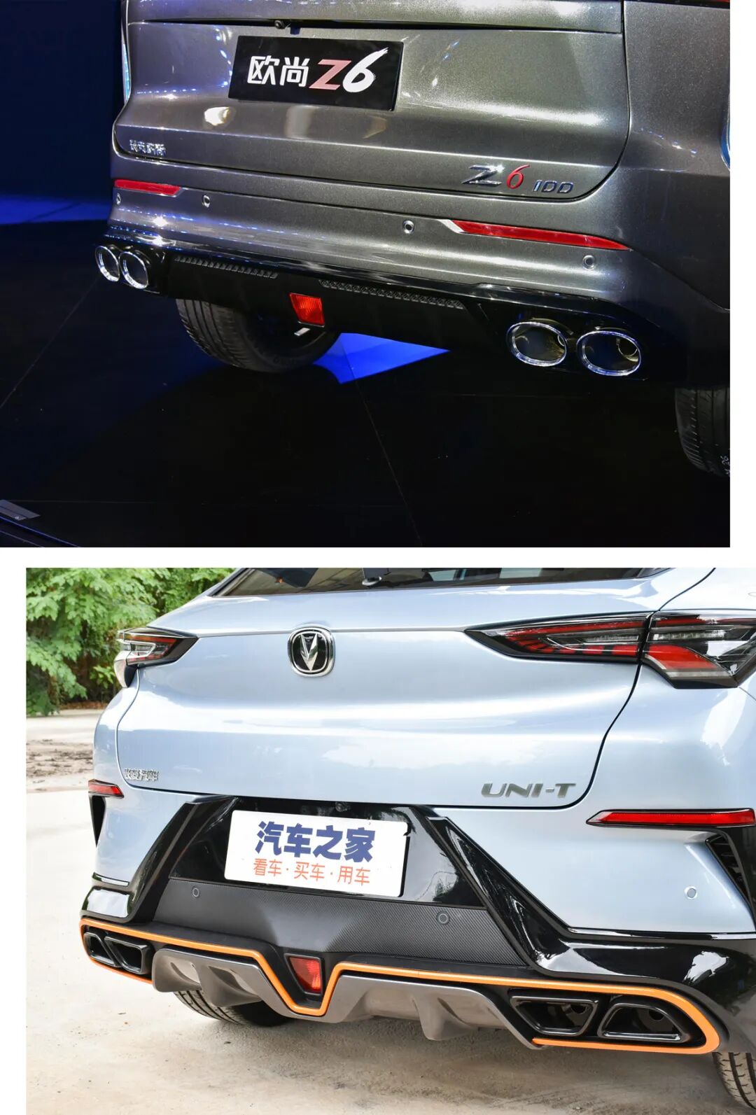 欧尚Z6和UNI-T都配备了四出排气,相比之下UNI-T的梯形尾喉要相对内敛一些。不过,欧尚Z6还提供双边共双出排气布局,选择相对丰富。