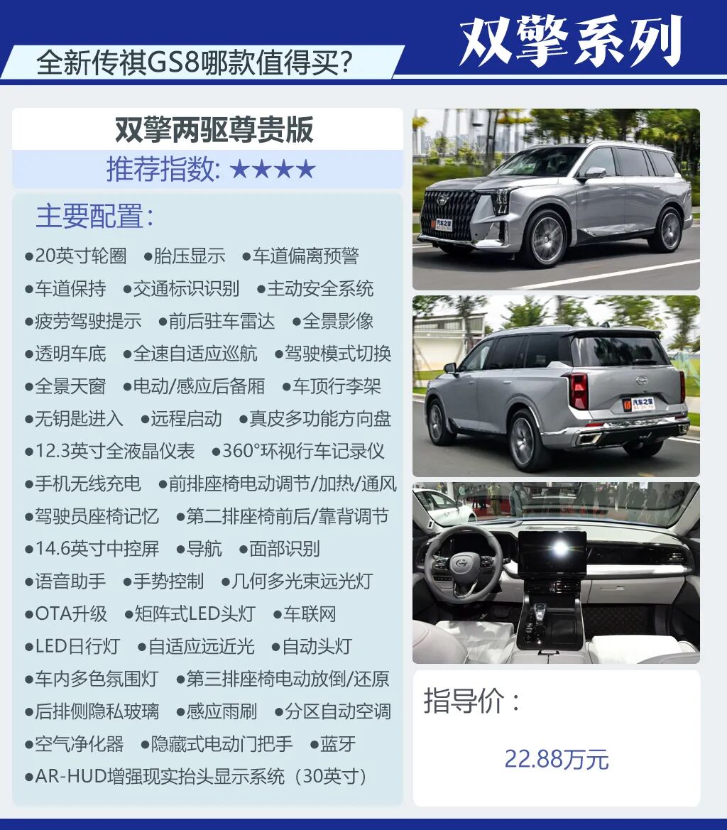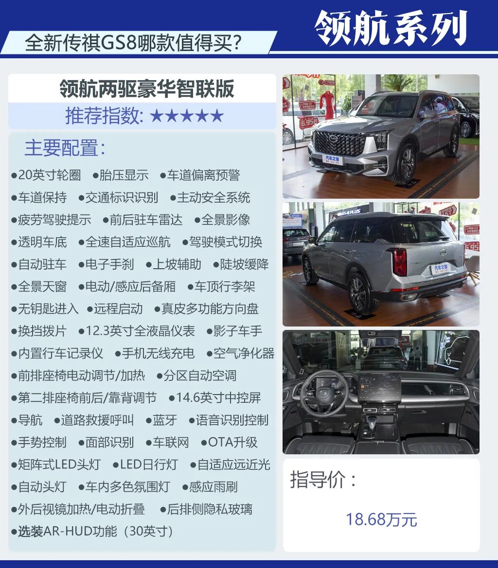 第二代传祺GS8基于GPMA广汽全球平台模块化架构L平台打造,提供领航和双擎两个系列,指导价格区间为18.68-24.68万元,而且提供6座和7座车型可选。此篇文章就来分析全新GS8哪款车型值得买。