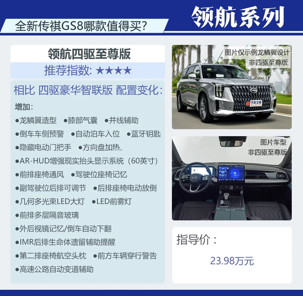 相比领航四驱豪华智联版,领航四驱至尊版指导价格增加3.4万元,后者采用龙鳞翼造型(领航系列唯一一款),气场更强大,而且AR-HUD增强现实抬头显示系统(60英寸)也是全系最大的。此外,后排生命体遗留辅助提醒、膝部气囊、LED前雾灯、第二排座椅航空头枕、前方车辆穿行警告、高速公路自动变道辅助,均为四驱至尊版独享配置。花费3.4万换来20余项配置,其中还有不少是专属配置,这样来看性价比也是不错的,预算充足可以考虑这款车型。
