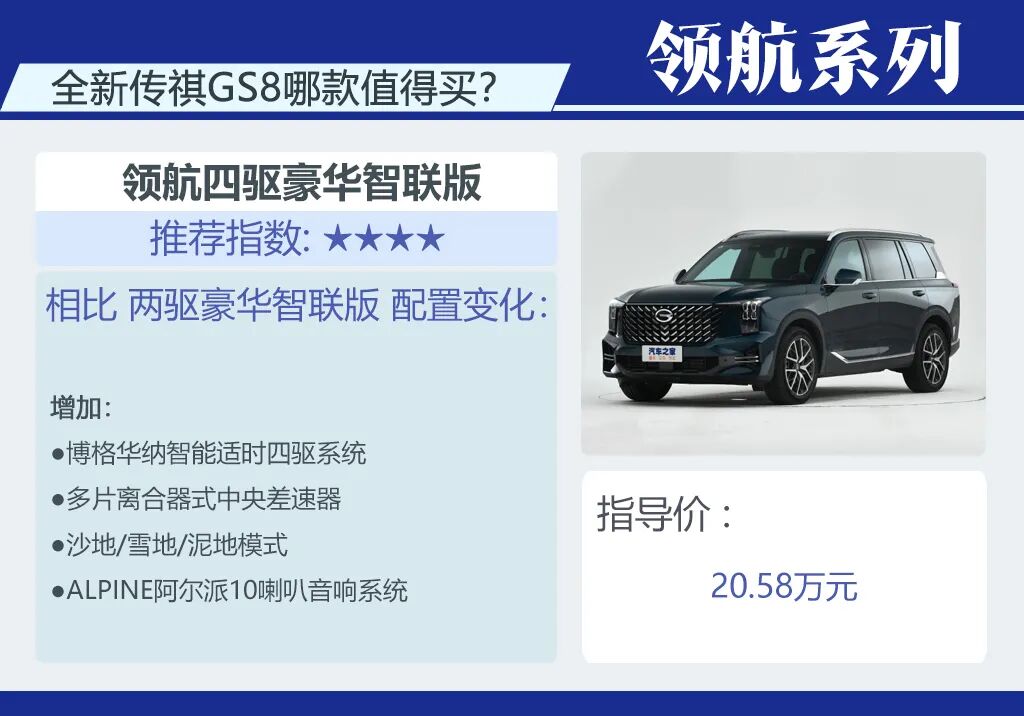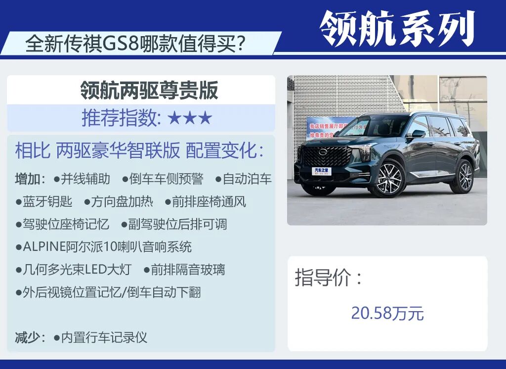 广汽传祺全新GS8领航系列分为四个配置级别,每个配置均提供6/7座车型可选;双擎系列设有两个配置级别,每个配置亦提供6/7座车型可选。