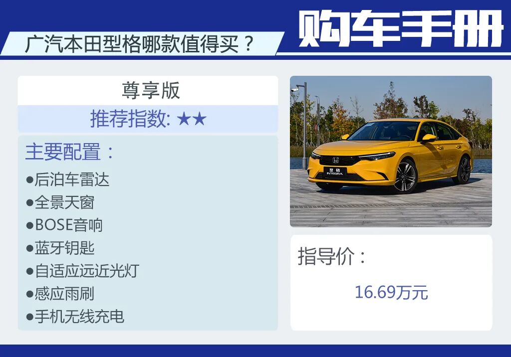 尊享版作为全系的顶配车型,后泊车雷达、手机无线充电、蓝牙钥匙、12扬声器BOSE音响、蓝牙钥匙、感应雨刷等等配置全安排上了。虽然该有的都有了,但16.69万元的价格并不低,适合那些预算充足的消费者。