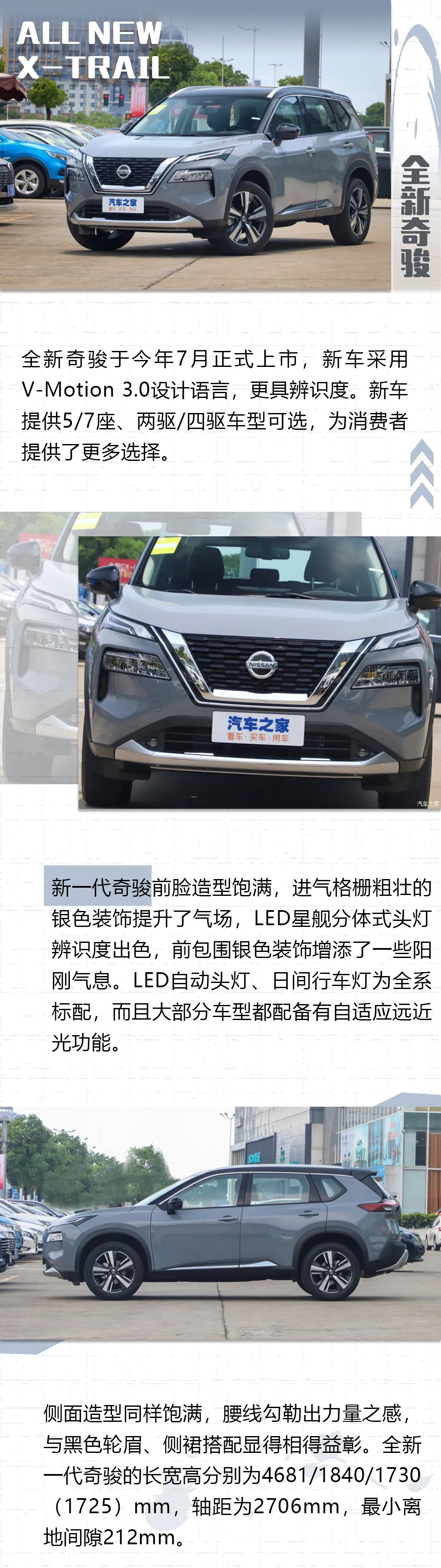 今年7月,奇骏迎来了第四代产品,新车基于CMF-CD平台打造,采用V-Motion 3.0设计语言,辨识度更高。全新奇骏全系共设有8款车型,包含两驱/四驱、5座/7座版本,指导价格区间为18.19-26.29万元。