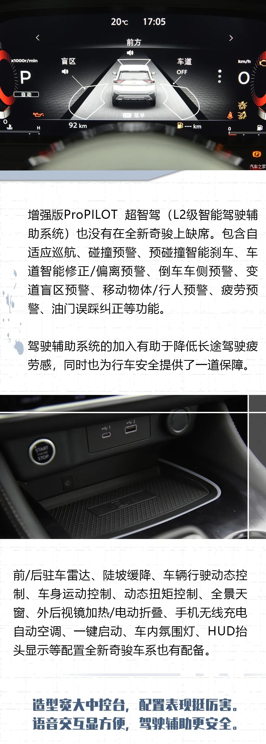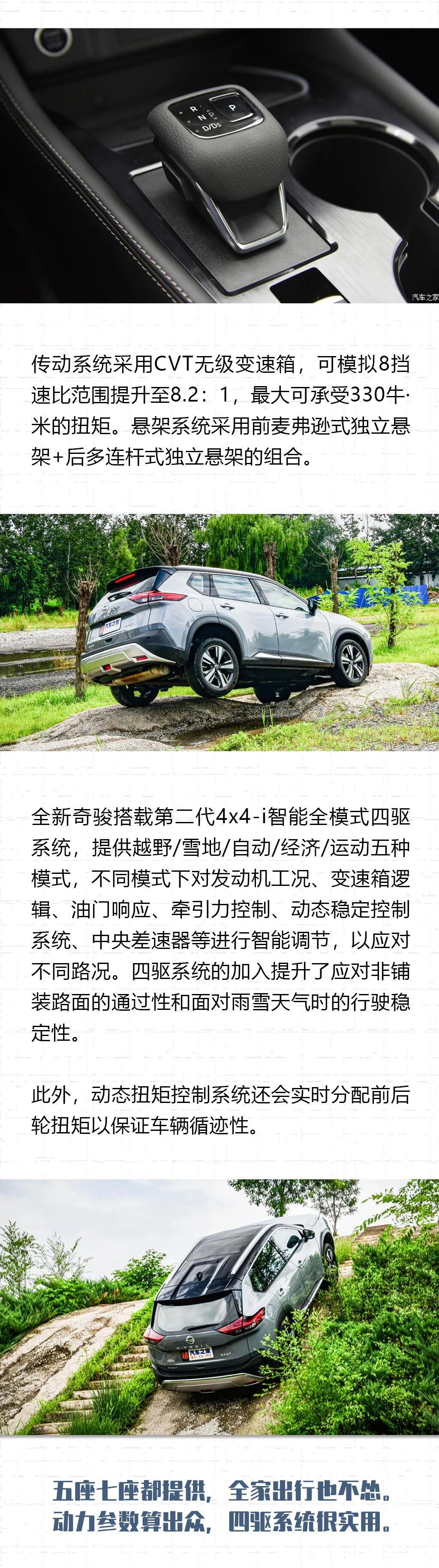 采用V-Motion 3.0设计语言的新一代奇骏拥有更出色的辨识度,同时内饰质感也得到了提升。配置方面全新奇骏也达到了同级主流水准,配备有Nissan Connect超智联2.0、增强版ProPILOT 超智驾等实用安全配置。提供5座/7座、两驱/四驱车型可选丰富了消费者的选择。如果各位春节假期有自驾出行计划,这款全新奇骏可以纳入考虑范围。