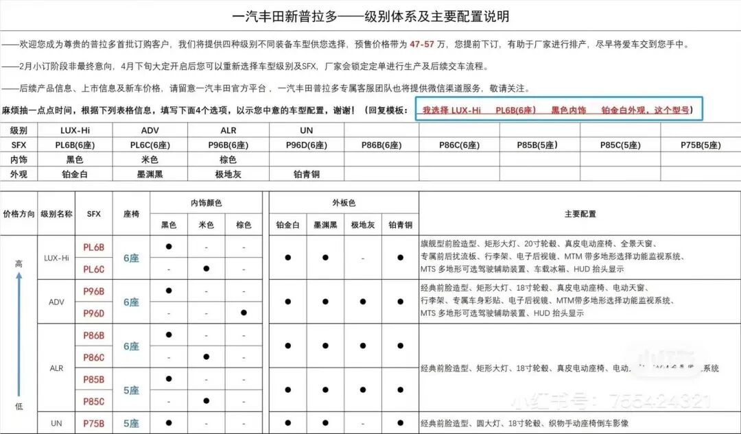近日,全新一汽丰田普拉多的预售价和部分配置信息迎来曝光。全新普拉多共将推出4款车型,预售价格区间为47-57万。此前网传信息显示新车将于2月29日预售并开启小订(中低配车型),4月25日北京车展高配车型首发并开启大定,7月16日正式上市。