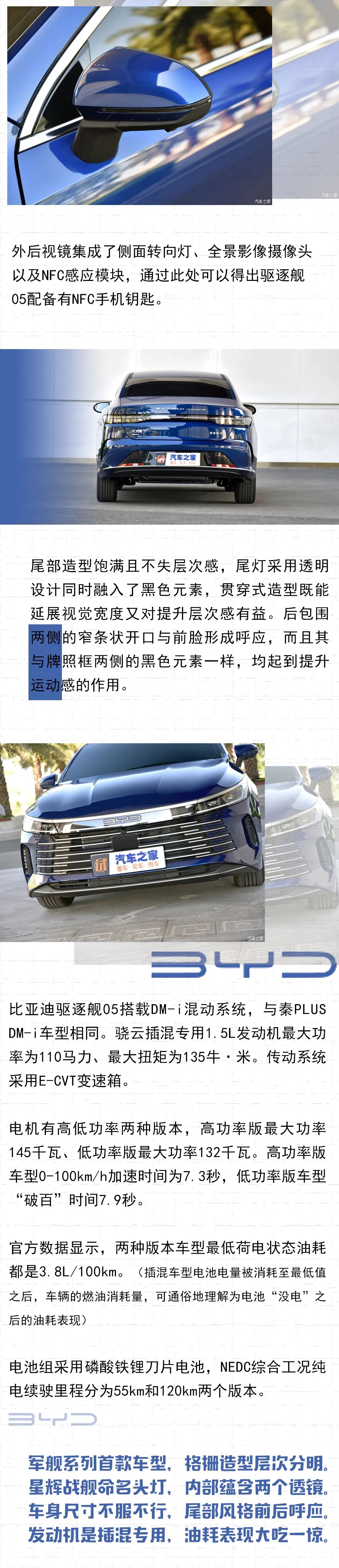 “海洋美学”设计理念赋予了驱逐舰05时尚清秀的外观,辨识度也比较不错。从外观来看,新车配备了LED头灯、自适应巡航、全景影像、手机NFC钥匙等功能,配置表现毋庸置疑。此外,DM-i混动系统也是新车的一大亮点,“破百”时间在8秒以内,而且馈电状态油耗也仅为3.8L/100km。新车内饰设计目前尚未有更多信息,不过相信很快就会有消息了,因为驱逐舰05将会于明年第一季度上市,感兴趣的各位不妨重点关注下。