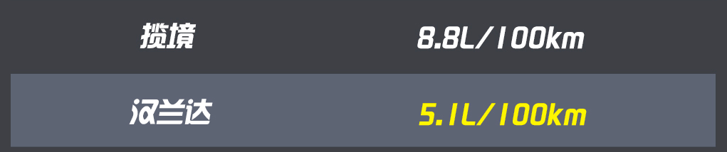 到了油耗环节,汉兰达再一次刷新了我们对于混动车型的油耗认知,5.1L/100km的油耗实属优秀,不得不佩服丰田这套混动系统。而作为一台中大型SUV的揽境,表现也不错,8.8L/100km在同级别2.0T竞品里也属于第一梯队。