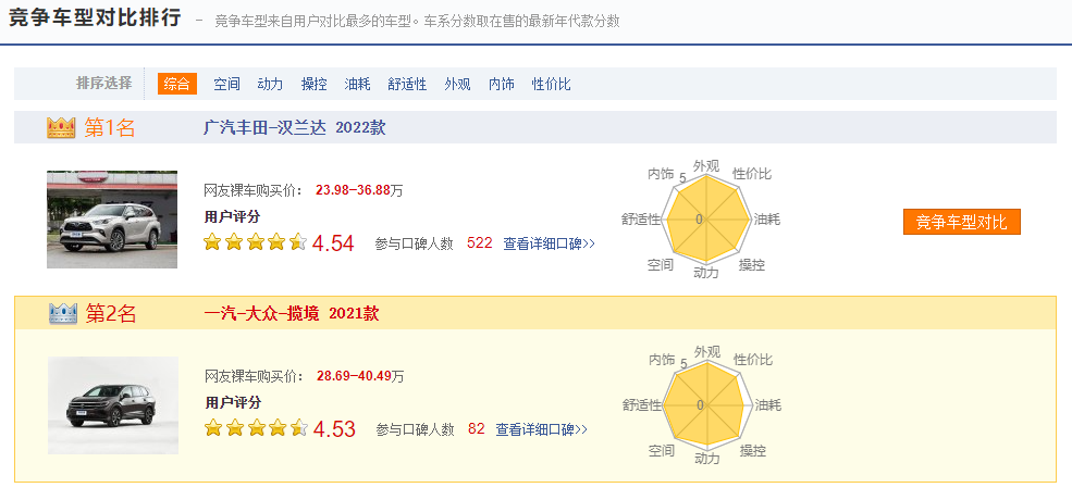35万元左右的热门家用SUV可选项非常多,我们选取了排行榜的冠、亚军,日系和德系,丰田和大众,广汽丰田-汉兰达和一汽-大众-揽境。具体车型选取在34万的档位,分别为汉兰达2.5L双擎四驱至尊7座(34.88万)和揽境380TSI四驱R-Line拓境版(34.29万)。