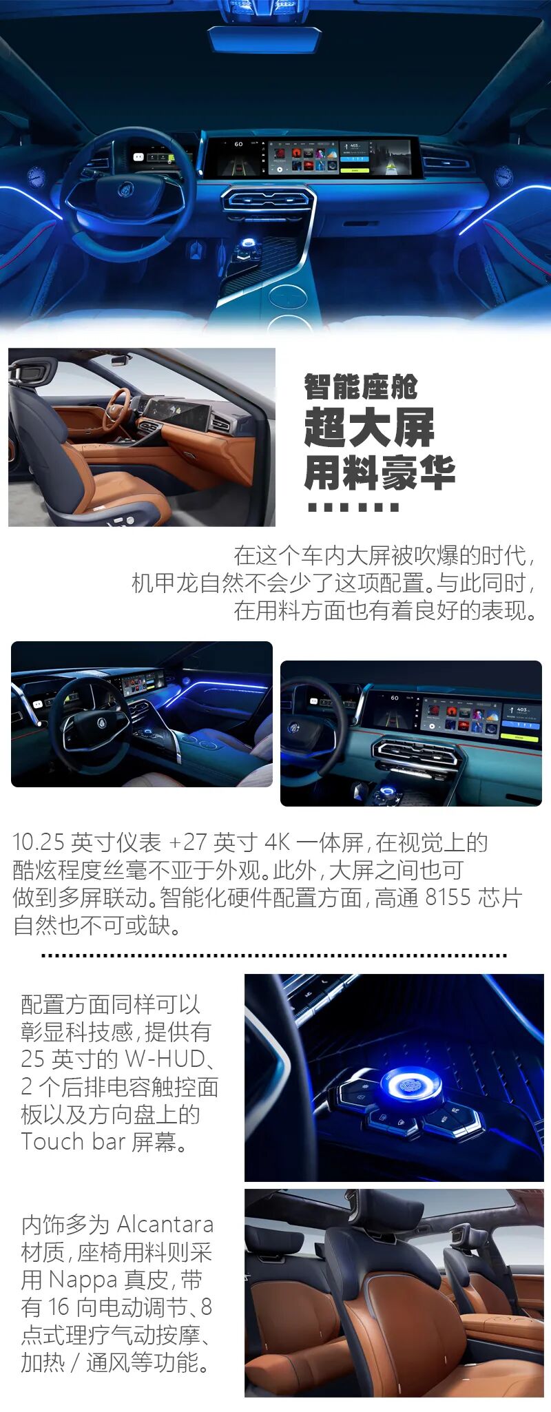 动力方面,机甲龙将搭载前后共两部永磁电机,最大功率405kW(551马力),峰值扭矩750牛·米,0-100km/h加速仅需3.7秒。动力电池为115kWh的大禹电池组,在CLTC工况下最大续航里程可达802km。此外,该车还支持800V/480kW超充,可在10分钟内增加续航401km,对于续航问题各位大可放心了。