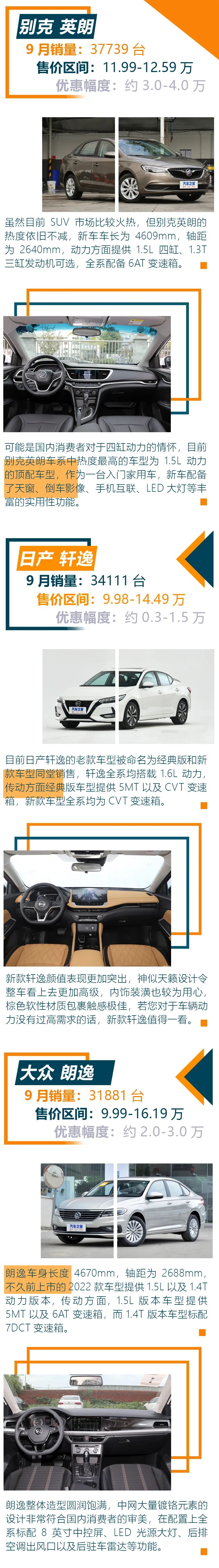 一年一度的双十一如约而至,相信各位朋友也都摩拳擦掌的准备清空购物车了,面对这样的购物狂欢节点,有购车需求的朋友也一定不能错过,本篇文章我们就来盘点分别在轿车、SUV、MPV中销量前三名的车型(燃油车),它们各个“身怀绝技”,有的月销超过30000台,有的终端降价超过5万,相信在这个特殊的节日中您也能选购到合适自己的座驾。