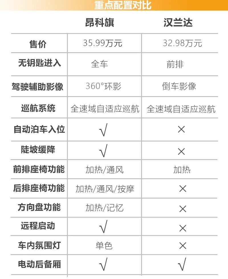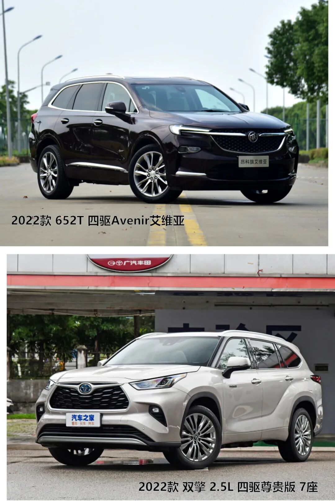 这一次对比的两台车分别为售价35.99万元的2022款 652T 四驱Avenir艾维亚别克昂科旗(以下简称昂科旗),售价32.98万元的2022款 双擎 2.5L 四驱尊贵版7座丰田汉兰达(以下简称汉兰达)。从汽车之家关注度排名来看,这两个配置版本在各自车系的关注度最高,虽然昂科旗的售价稍高,但有着一定的终端优惠,所以在售价方面也基本相同。