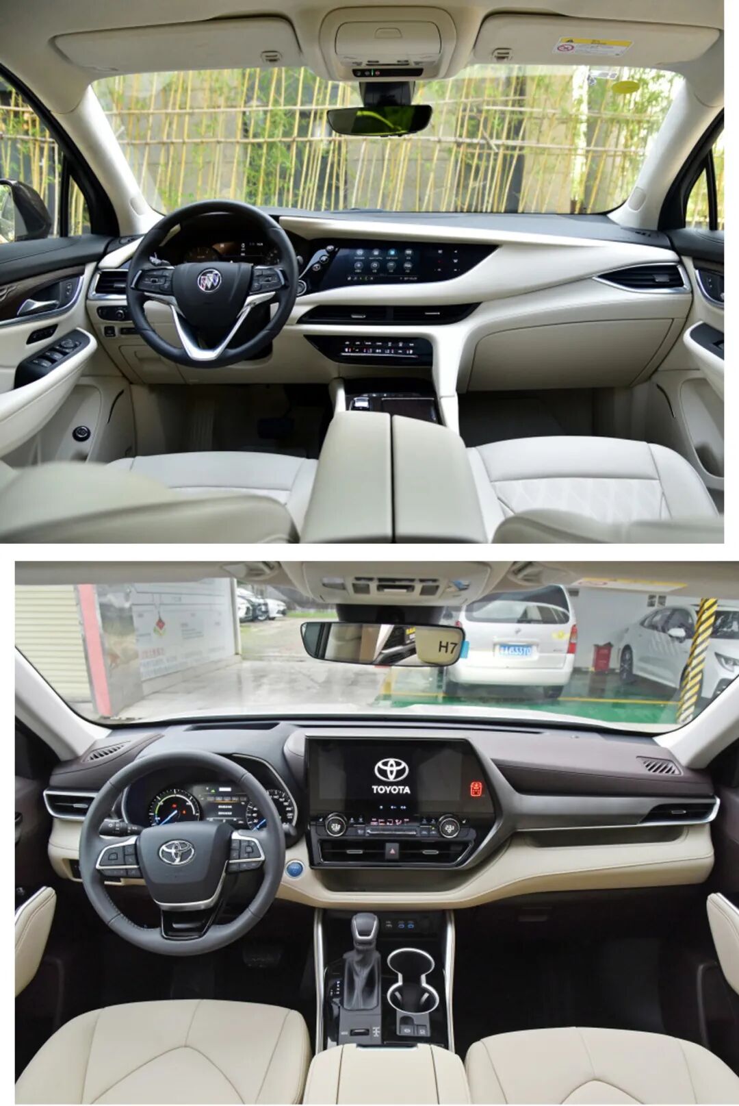 进入车内,两款车型都是居家风格,但在用料和氛围上截然不同。昂科旗采用了艾维亚车型专属的象牙白内饰,车顶拥有麂皮材料,座椅和门板处都拥有菱形元素进行修饰,在豪华感的营造上还是很到位的。
