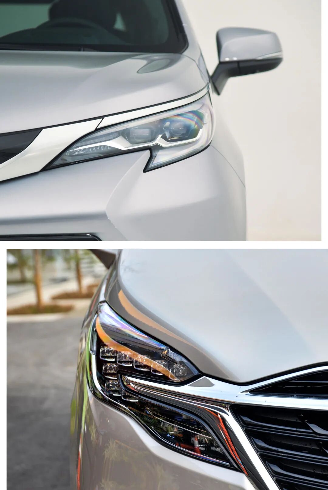 大灯方面,赛那所配备的LED大灯在内部灯线上进行了调整,相比海外版本更加犀利,并且具备自适应远近光功能。GL8由8颗灯珠组成的矩阵式LED大灯造型精致时尚,同时可以根据路况和车速实现7种智能照明模式。