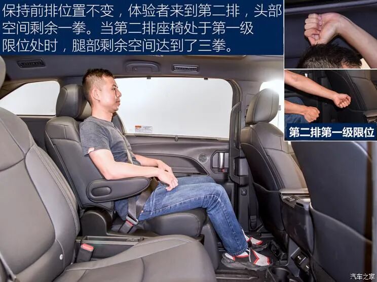 在体验者身高相差不大,且第三排腿部空间均为1拳左右时,赛那的第二排腿部空间有一定的优势,车内纵向空间要优于GL8。