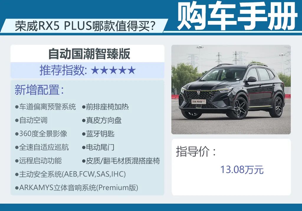 新款RX5 PLUS在同级别中有着较强的实力和诚意,官方指导价为13.08万元的自动国潮智臻版为主推车型。该配置车型配备了车道偏离预警系统、主动安全系统、360度全景影像、全速自适应巡航等配置。对日常用车便利性提升明显,性价比突出,适合年轻消费者。