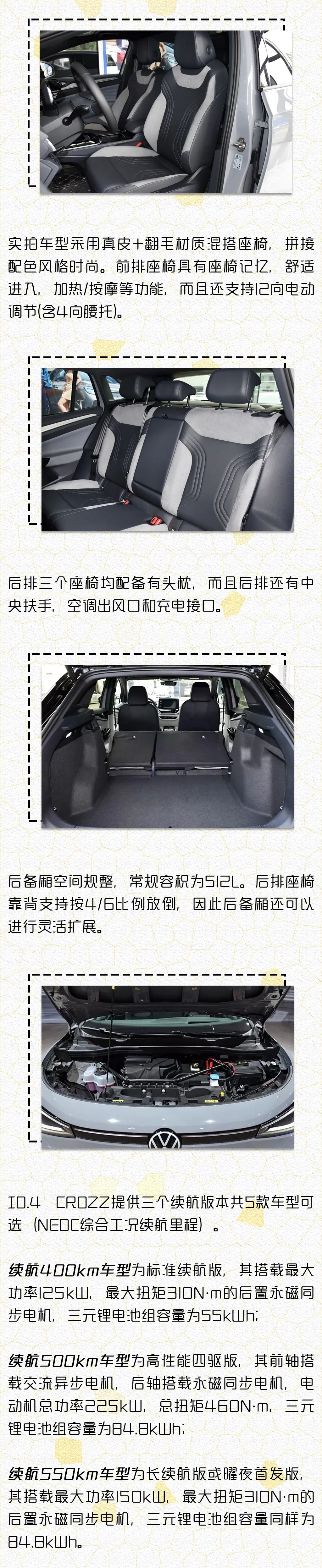 ID.4 CROZZ车系提供三种续航版本共5款车型可选,指导价格区间为19.99-27.99万元,如果你预算30万元以内想入手一款纯电动SUV,这款有大众品牌光环加持的ID.4 CROZZ可以纳入考虑范围。