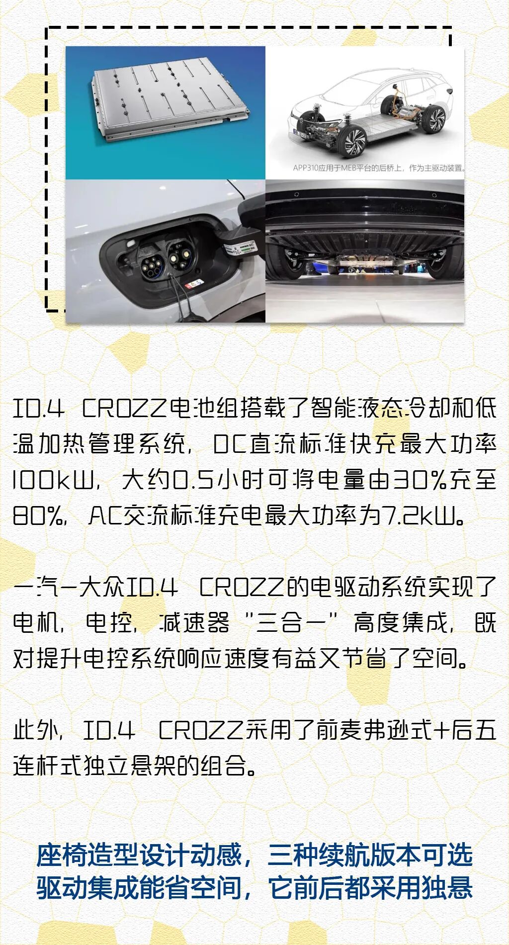 一汽-大众旗下首款出身于MEB平台的产品是ID.4 CROZZ,同时它也是一汽-大众首款纯电动SUV。由于该车基于专业的纯电动平台打造,所以相比一些“油改电”车型,ID.4 CROZZ拥有容量更大的电池组和更远的续航里程。