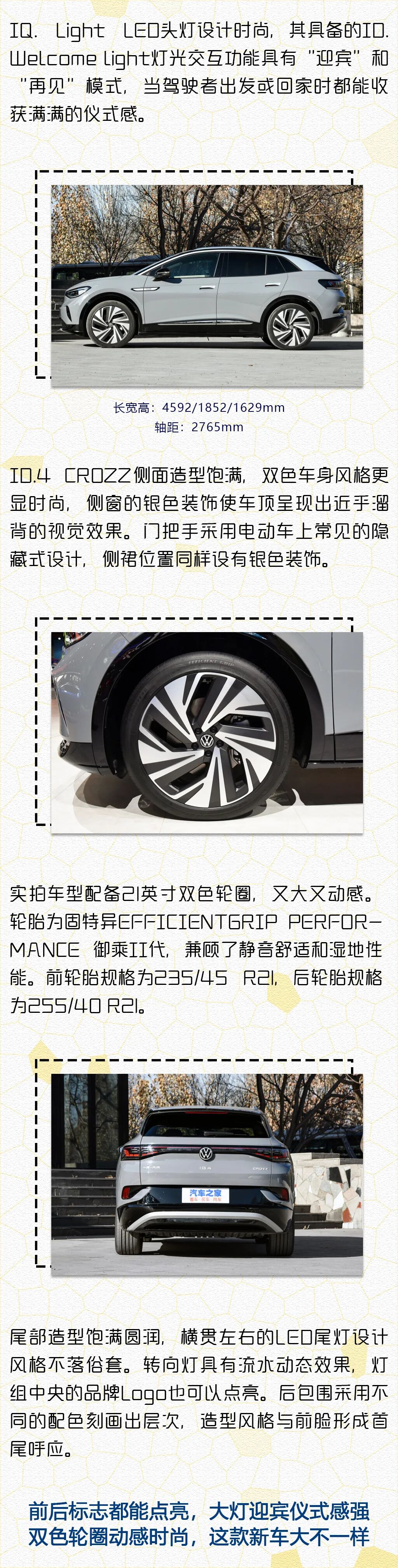 出身于MEB平台的ID.4 CROZZ续航能力确实比此前的“油改电”产品更加出色。ID.4 CROZZ还具备时尚动感的外观内饰设计,而且配置表现也比较不错。此外,ID. Welcome light灯光交互、ID. Light 智能交互呼吸灯显著提升了人车交互感和沟通感。