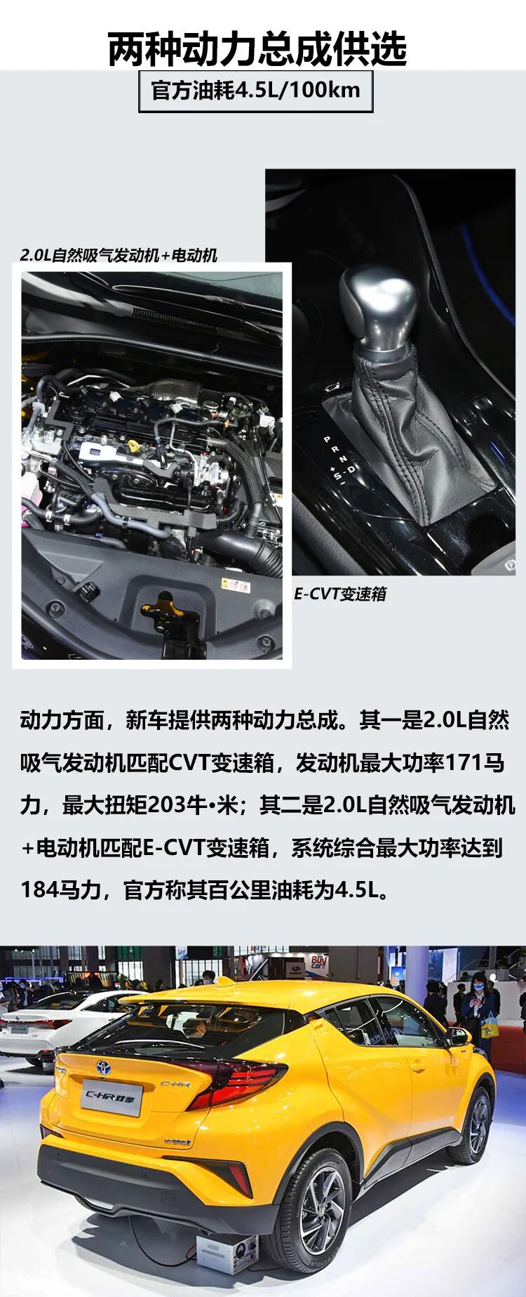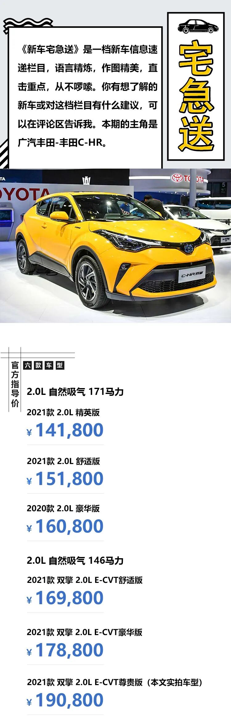5月28日,广汽丰田旗下新款C-HR正式上市,新车共推出了6款车型,售价区间为14.18-19.08万元。新车的最大革新点来自于开始搭载2.0L混合动力系统,这在小型SUV市场里还是独一份,快通过下面的一组长图了解一下吧。