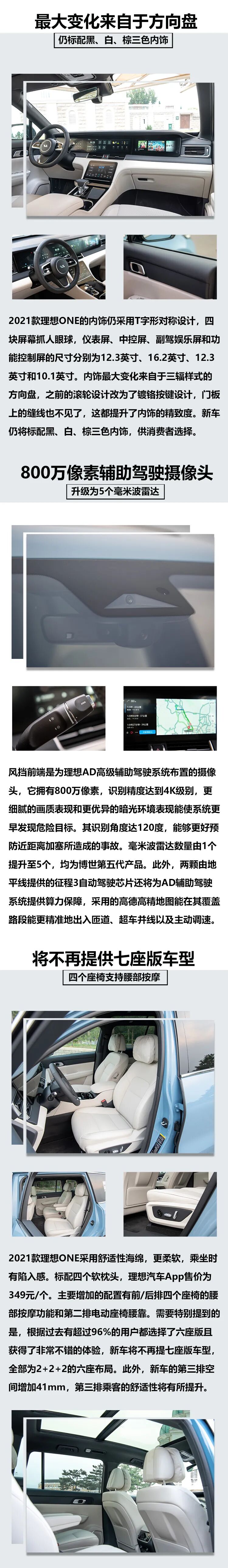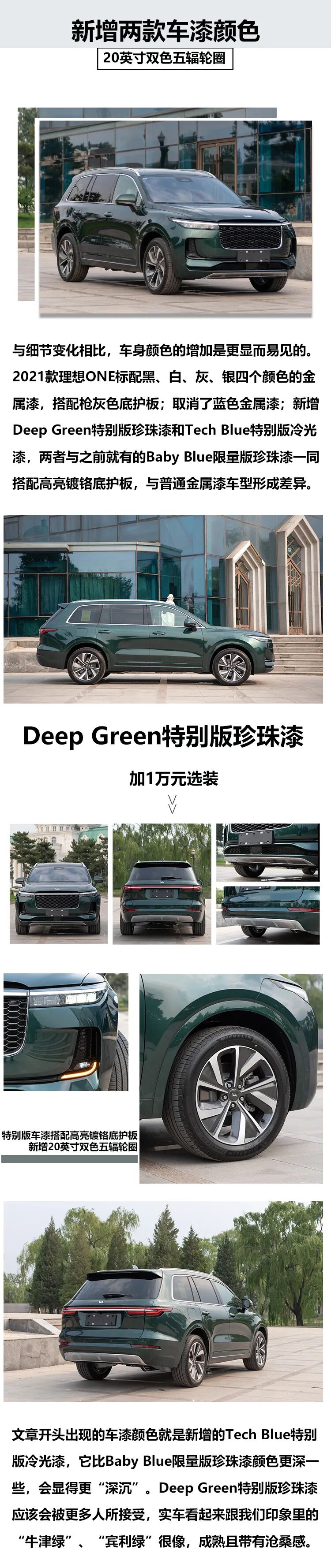 昨天晚上八点,理想汽车举行了2021年春季发布会,2021款理想ONE在会上正式上市。新车共推出一款车型,售价为33.8万元(黑、白、灰、银色),Baby Blue/Deep Green/Tech Blue三种特别版车漆需要加1万元。新车主要在辅助驾驶系统的软硬件以及配置上有所升级,外观和内饰设计几无变化,且只提供六座版车型,下面我们就通过一组长图了解一下它。