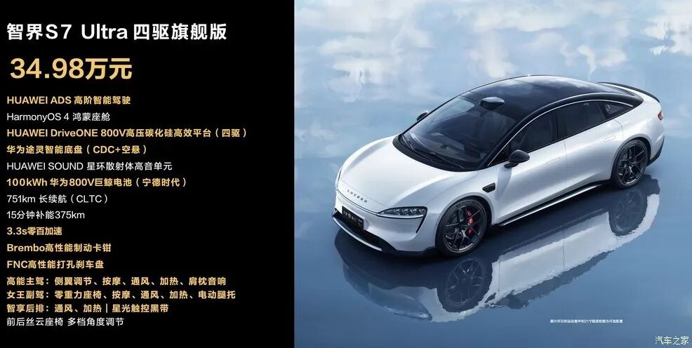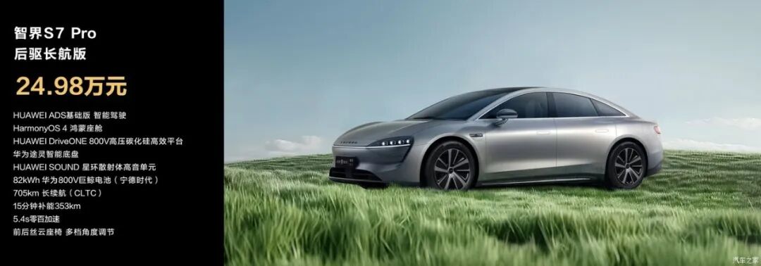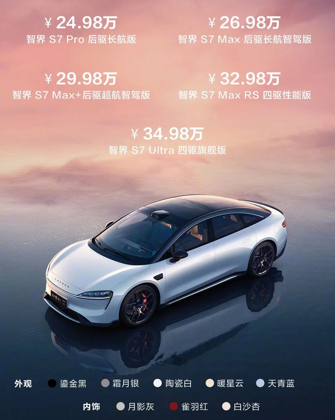 4月11日,新款智界S7于华为鸿蒙生态春季沟通会上正式上市,价格区间为24.98-34.98万元。