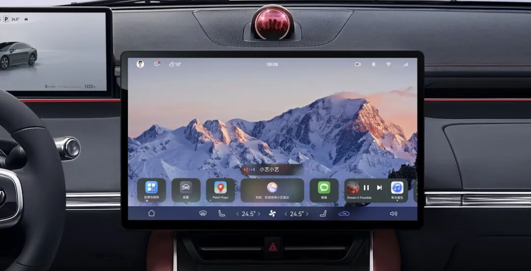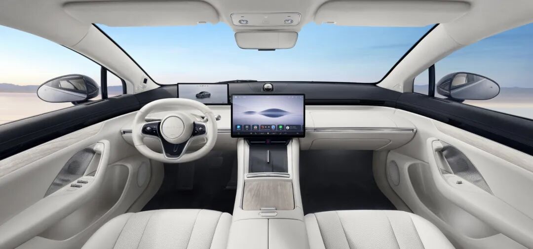 简洁的车内设计采用环抱式游艇座舱,中控台造型平直纤薄,椭圆的方向盘也很有特点。车机采用HarmonyOS 4系统,拥有3D车控桌面以及盘古大模型助力的语音助手等功能。