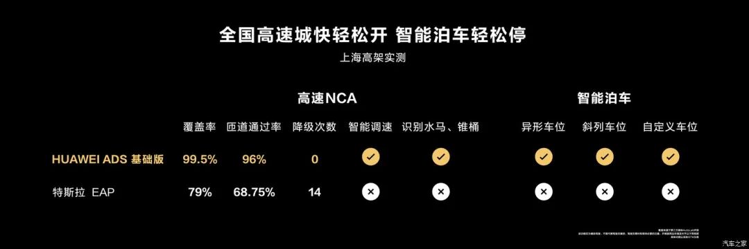 这套视觉方案可以实现在全国高速与城市快速路的NCA 智驾领航辅助,可自动上下匝道,遇到施工锥桶改道等场景,拥有一定的自动换道避障绕行的能力。上图是智界官方公布的华为ADS基础版与特斯拉EAP的一些实测对比。