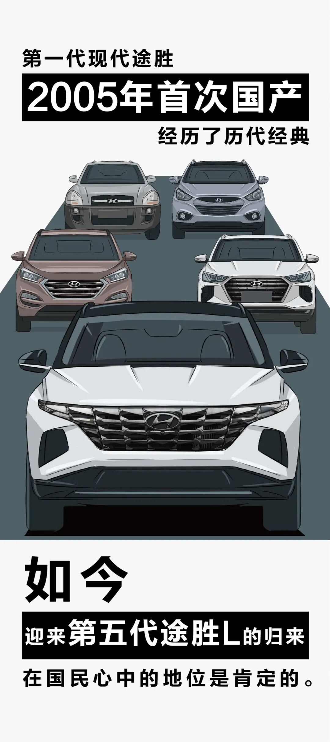 现代途胜自2005年国产上市以来,经历了数代车型的更迭,如今迎来第五代全新途胜L。现代途胜是许多国内消费者的第一辆SUV,16年间收获了超过百万的国内车主,给一代人留下了深刻回忆。